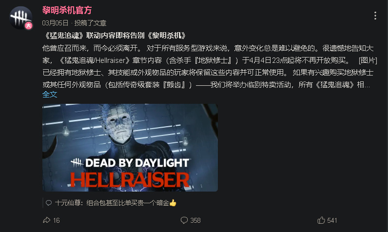 还有不到一周钉子头联动即将结束,我是很喜欢美式恐怖IP的,也刷到过小道消息称目前钉子头IP版权已经从望远镜回到作者本人手中,如果无法谈回来的话,会给我们一个新的信号,未来其他IP,是不是也会面临这样的问题,毕竟杀机能焕发第二春,完全是靠联动做出来的,没有这些联动杀机的玩家必然会造成大量流失,但是联动喰种也给出两个信号:一是杀机的IP联动,也越来越难找,毕竟这游戏寿命已经相当长了,BE用这么多年也证明了除了杀机这种老天赏饭,其他旗下游戏全部会暴死,希望能在10周年附近的时候看到杀机的续作,现在的石山代码已经经不起大改折腾了。