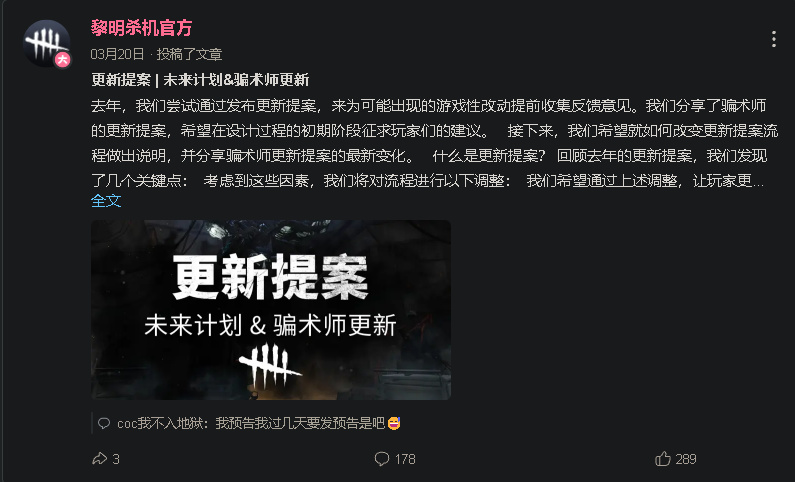 写这篇文章的还有一个原因,是杀机又开始摆烂,又开始向玩家求助,所以这篇文章,还是聊聊杀机这游戏在运营方面目前的现状。