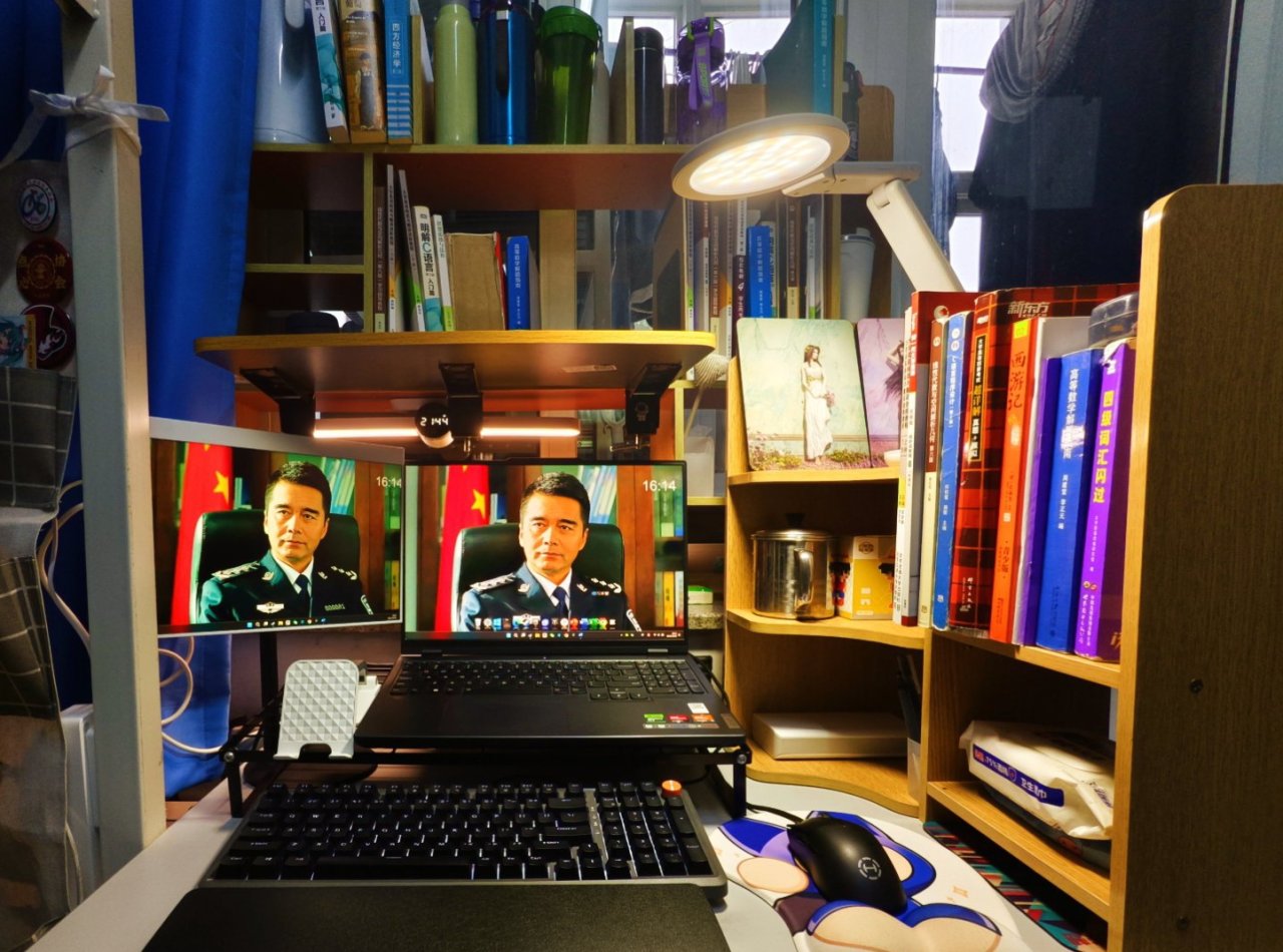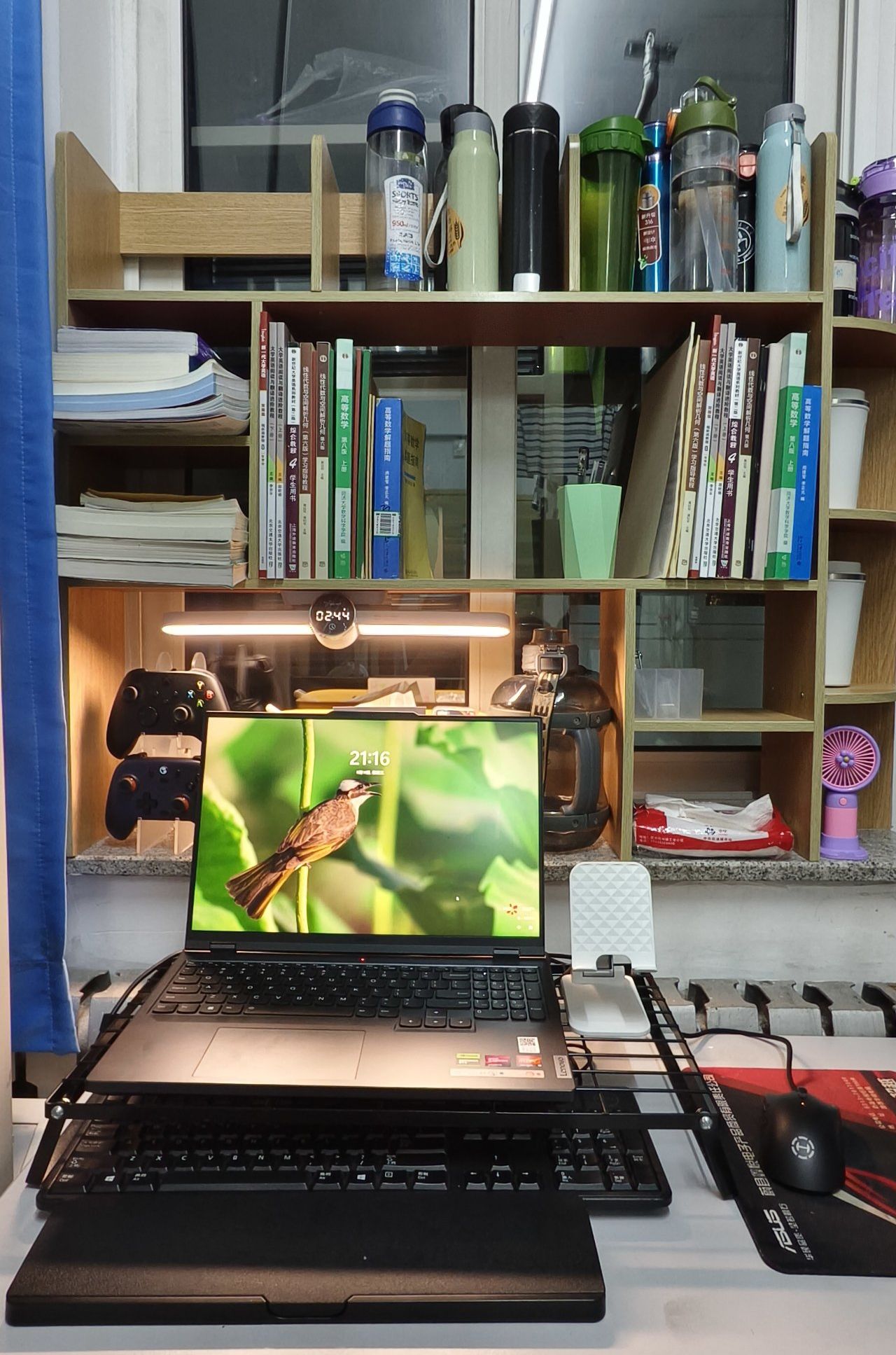 十一後,覺得桌子空蕩蕩的,又買了便攜屏和支架,右側小書架。這時書桌已是完全體,爽用了很久。