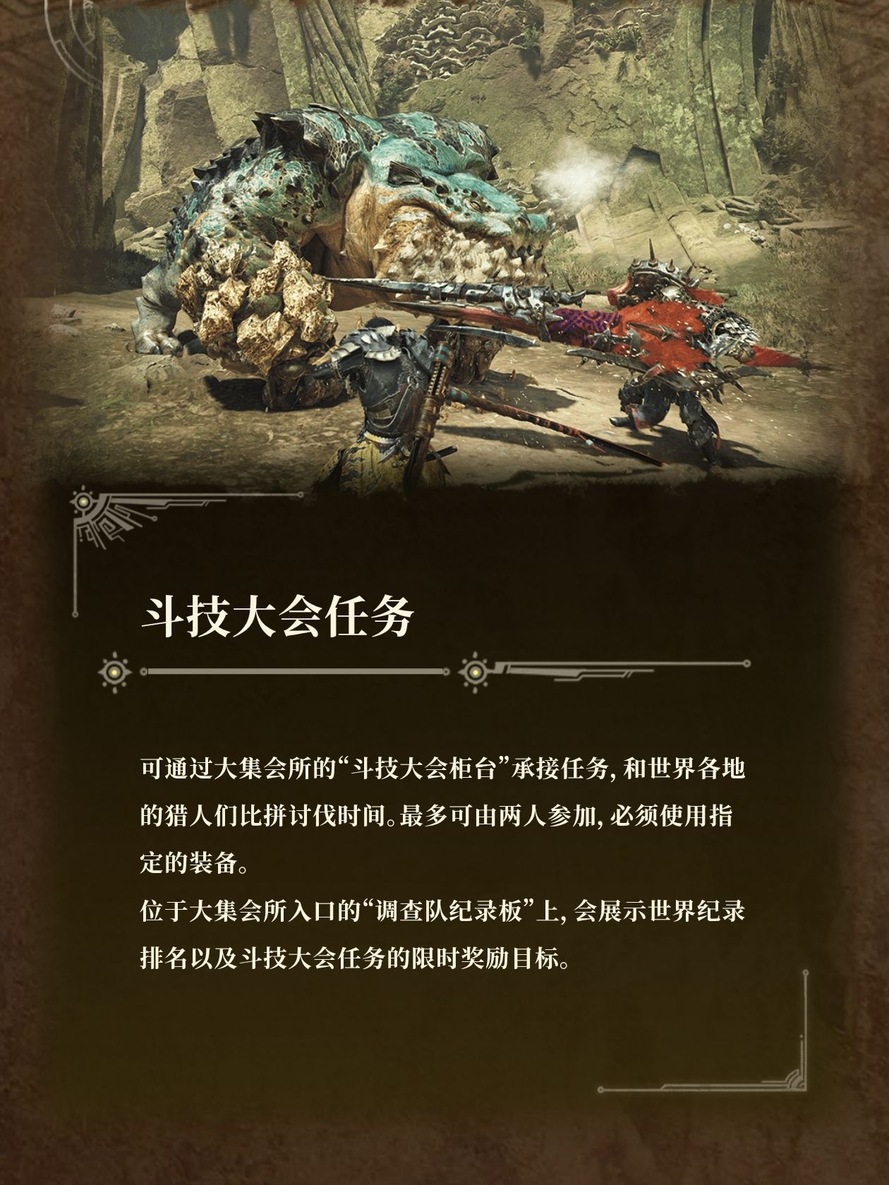 本次更新还增加了“斗技大会任务”,最多能两人挑战,入口的调查队记录榜可以看到全球玩家的成绩,其中会有限时发布的挑战任务与自由挑战任务,完成后可以获得饰品,如果记录与排名越好,则获得的饰品就越豪华。