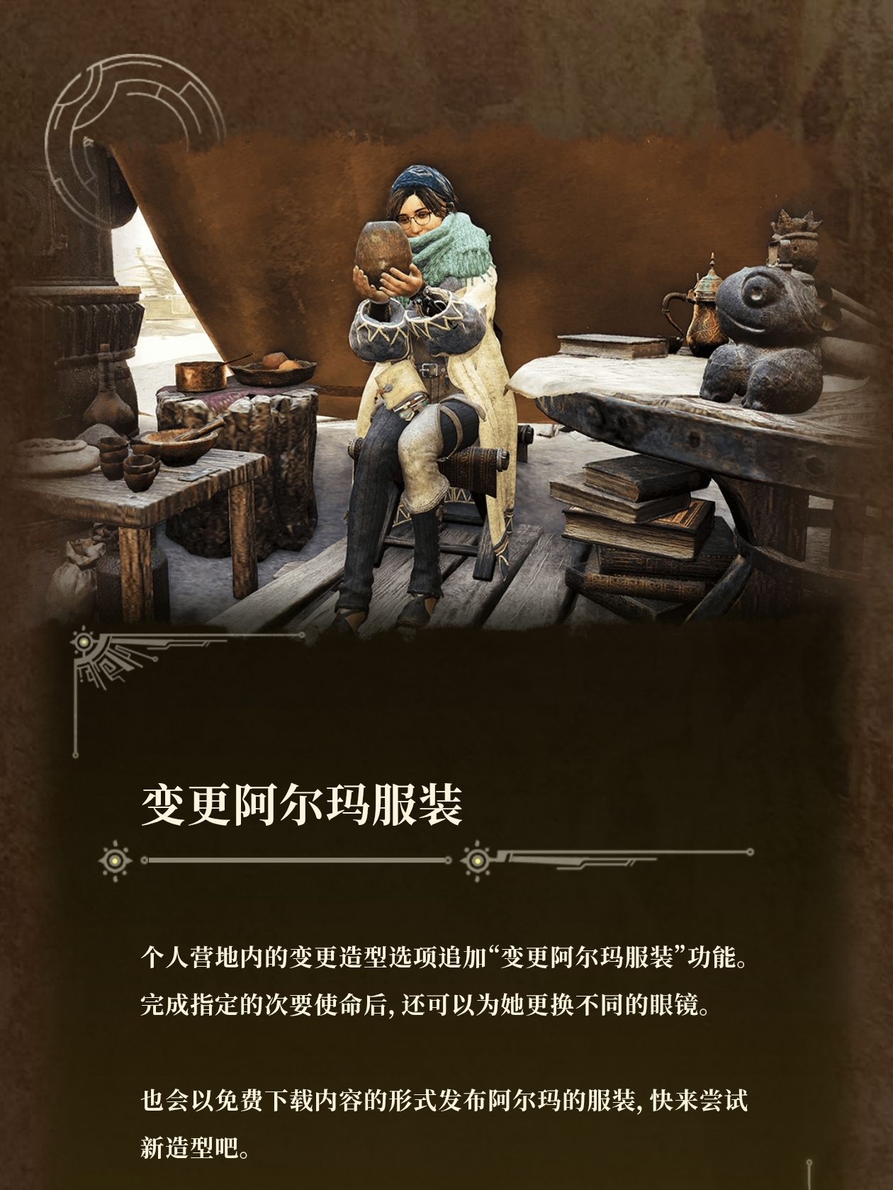 随着本次大型更新上线,卡普空也推出了首个外观DLC组合包,拥有高级豪华版、外观DLC通行证的玩家能够获得不少新外观。同时,可下载内容里也会增加营地设备的项目。
