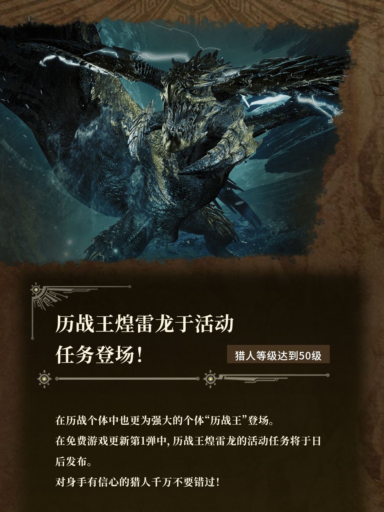 玩家在达到HR 21后前往绯红森林与NPC对话,便会开启泡狐龙任务;而历战王煌雷龙则会在4月30日的活动任务中登场,HR 50以上可接,并且会有新的防具可制作。同时,白炽龙在本次更新后也可以重复对战,它会在龙都遗迹的“龙之觉醒”期间低概率出现,玩家可以在环境概要中将其设置为任务,同样需要达到HR 50才能狩猎它。