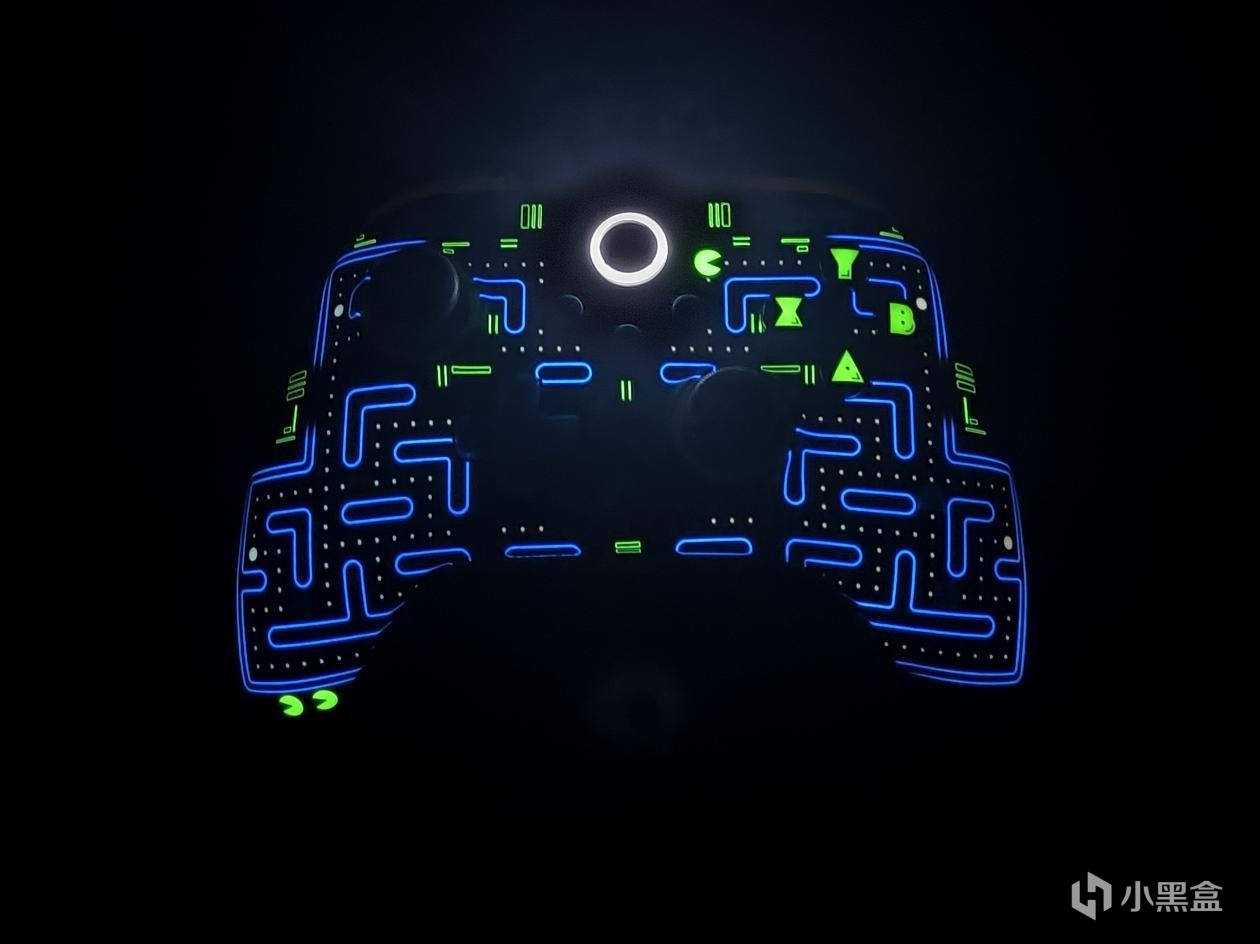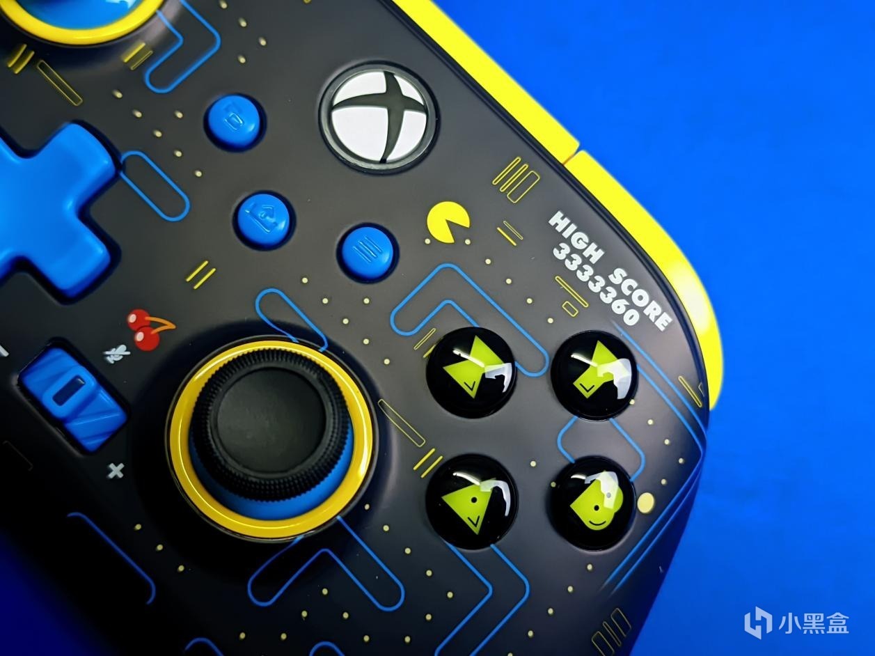 那我這邊自然也是順了一隻過來,單純從包裝方面,這應該就是很多XBOX手柄愛好者會入手收藏的樣式了,畢竟其採用的是比較稀有的黑色系背景,而不是微軟要求的白色背景,主體部分的手柄樣式也很漂亮,並且除了都有的XBOX圓形標記外,左側底部也有着單獨的LOGO標,使得手柄整體排布非常對稱,一個正面有着三家LOGO還是比較不錯的,嚴格意義上來說,這也是三方聯名了,Power A x 微軟 x 喫豆人,到這,你的六百已經差不多用完了(樂)