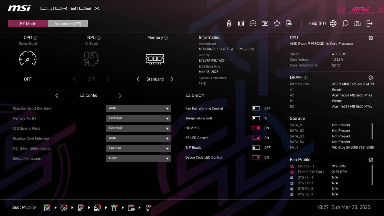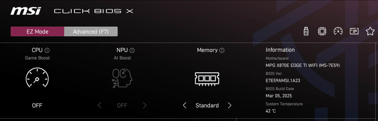 回到主板这边,微星MPG X870E EDGE TI WiFi 刀锋钛主板的BIOS界面也升级到了全新的UI设计,风格相比之前有了不小的变化,配色以黑色搭配粉色为主。很多功能都可以直接在EZ Mode界面进行设置,Game Boost的一键开启、EXPO内存模式等等。