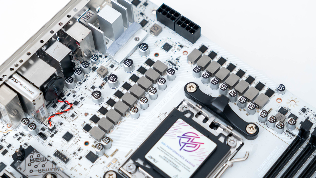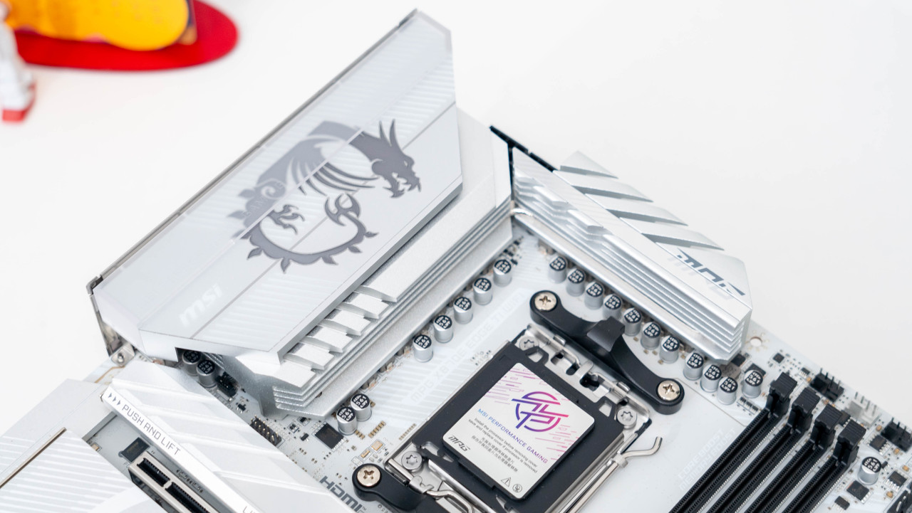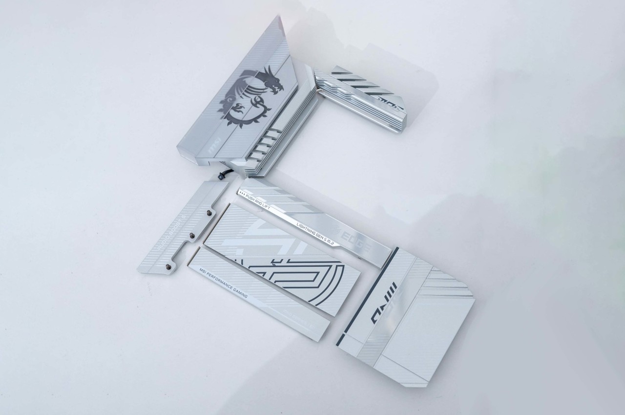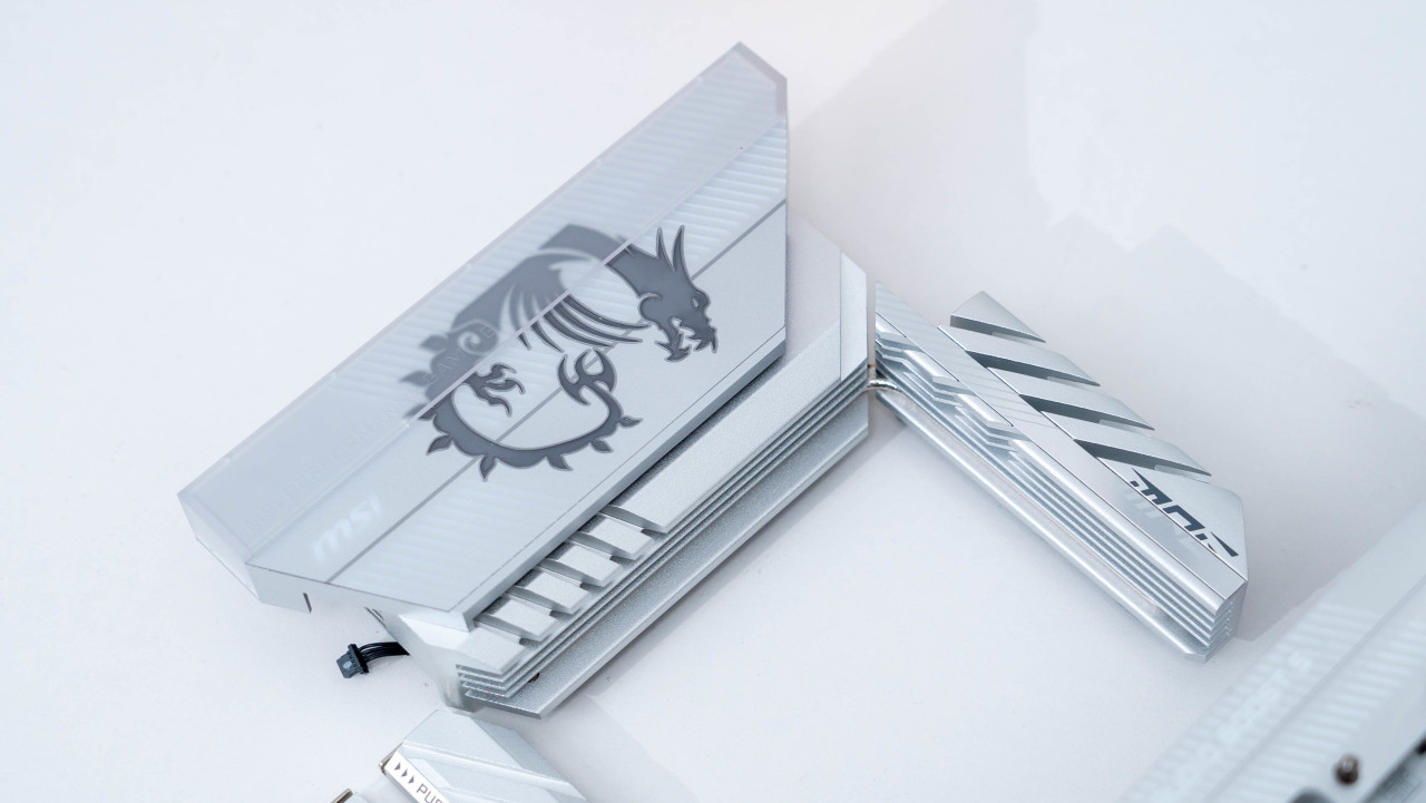 主板正面白色的PCB搭配银色的散热铠甲颜值非常好看,半镜面半磨砂的设计的MPG LOGO和带有RGB灯效的微星龙盾logo增加了辨识度。堆叠式设计的散热铠甲配合导热贴可以大幅提升散热效果。