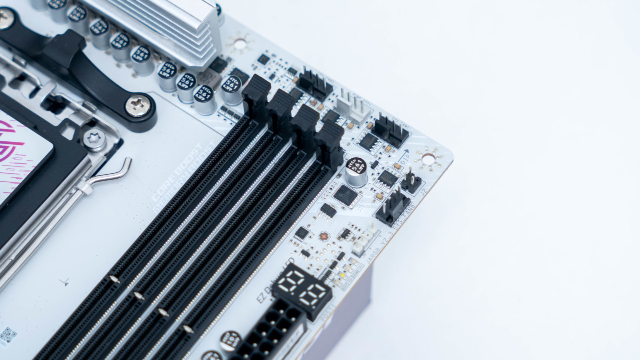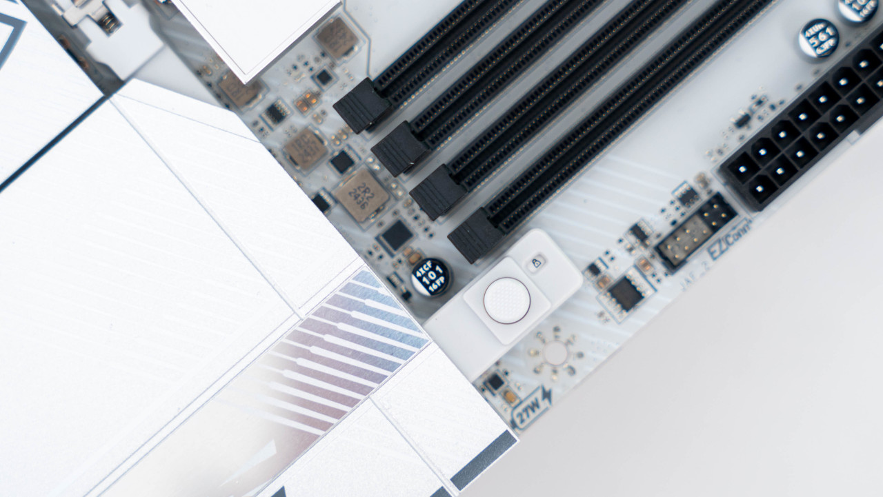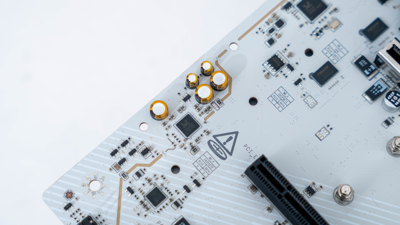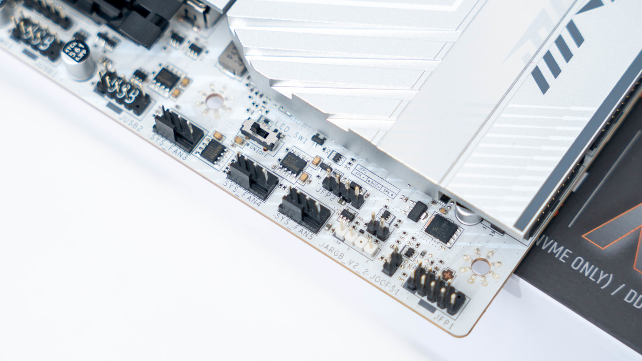 主板正面白色的PCB搭配银色的散热铠甲颜值非常好看,半镜面半磨砂的设计的MPG LOGO和带有RGB灯效的微星龙盾logo增加了辨识度。堆叠式设计的散热铠甲配合导热贴可以大幅提升散热效果。