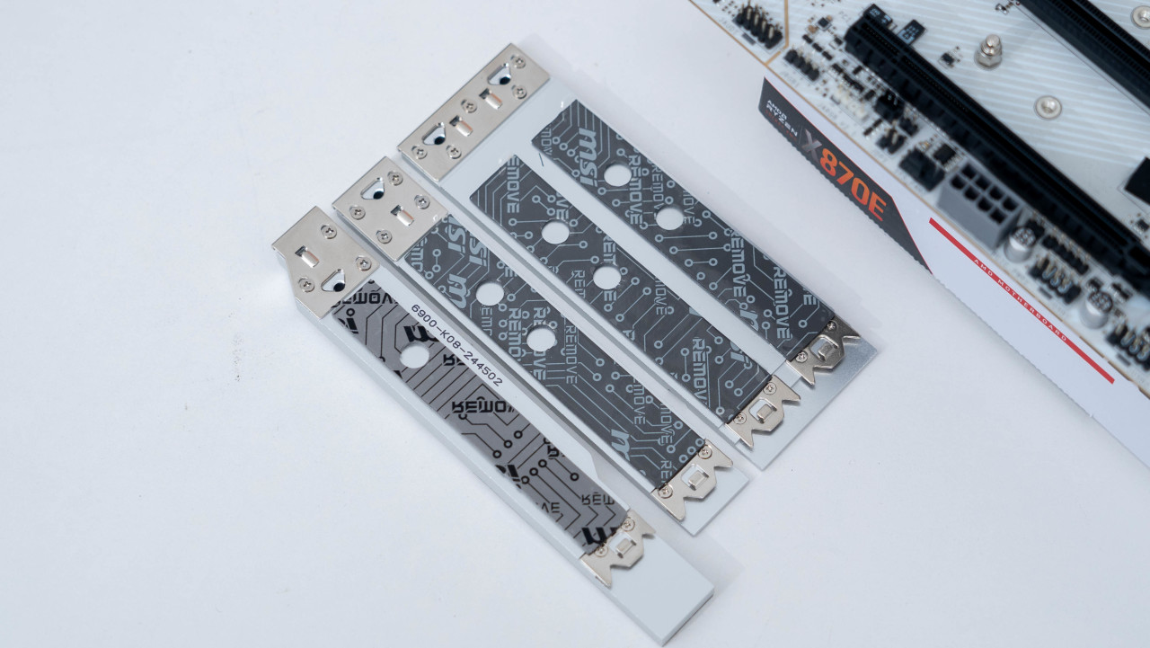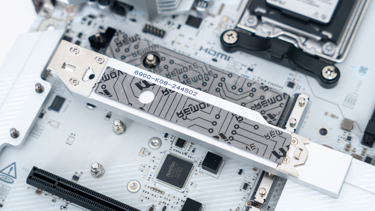 三条全长的PCIe x16插槽以及四个M.2 SSD硬盘的扩展配置在在X870E芯片组主板上可谓非常豪华了。其中四个M.2 SSD接口均配置了散热铠甲来帮助散热。