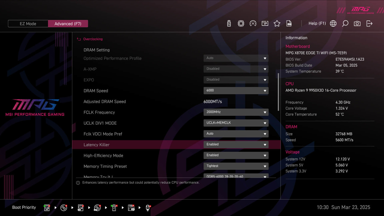 另外再内存参数方面,简单地开启黑科技Memory Try It!我是没办法满足的,毕竟微星还提供了进一步降低延迟的选项,如果你也是和我一样选择6000MHz CL28时序的内存的话,下面的作业是可以抄一下的。