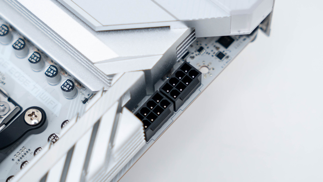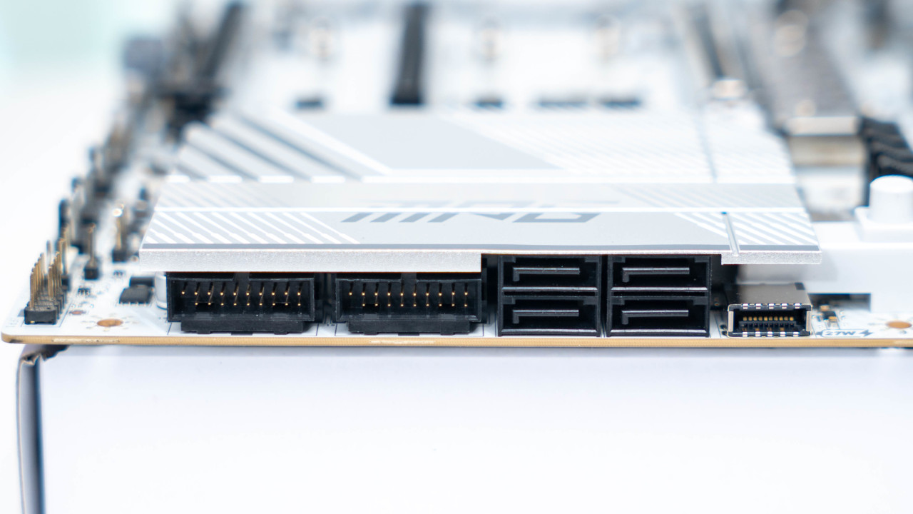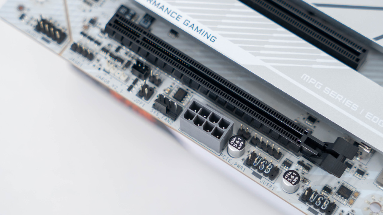 微星主板在800系主板上都加入了专为PCIe 5.0的加强供电设计,在主板底部会看到一个单独的灰色设计的8 Pin供电接口。