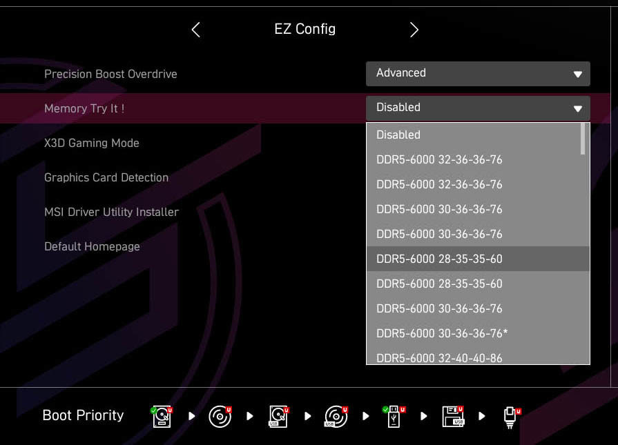 而说到主板BIOS的话,回到微星X870E刀锋钛这款主板。可以看到微星全新打造的BIOS页面,整体为普通玩家有诸多细节考虑。让玩家在进入BIOS界面后在EZ Mode界面就可以快速设置PBO模式,而且微星也提供了多种PBO预设可选。此外像是内存优化上,微星的Memory Try It!黑科技也可以帮助玩家实现更好的游戏性能释放。