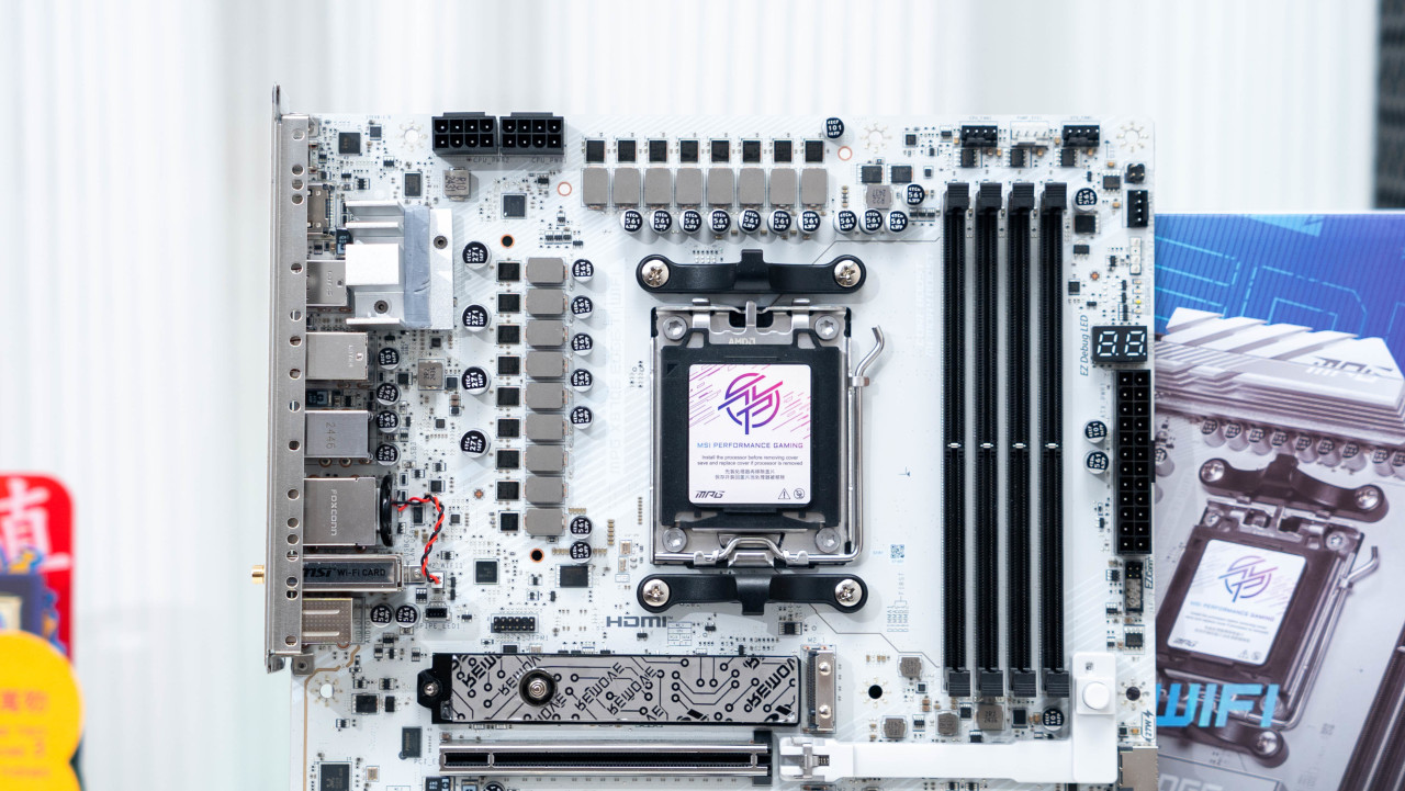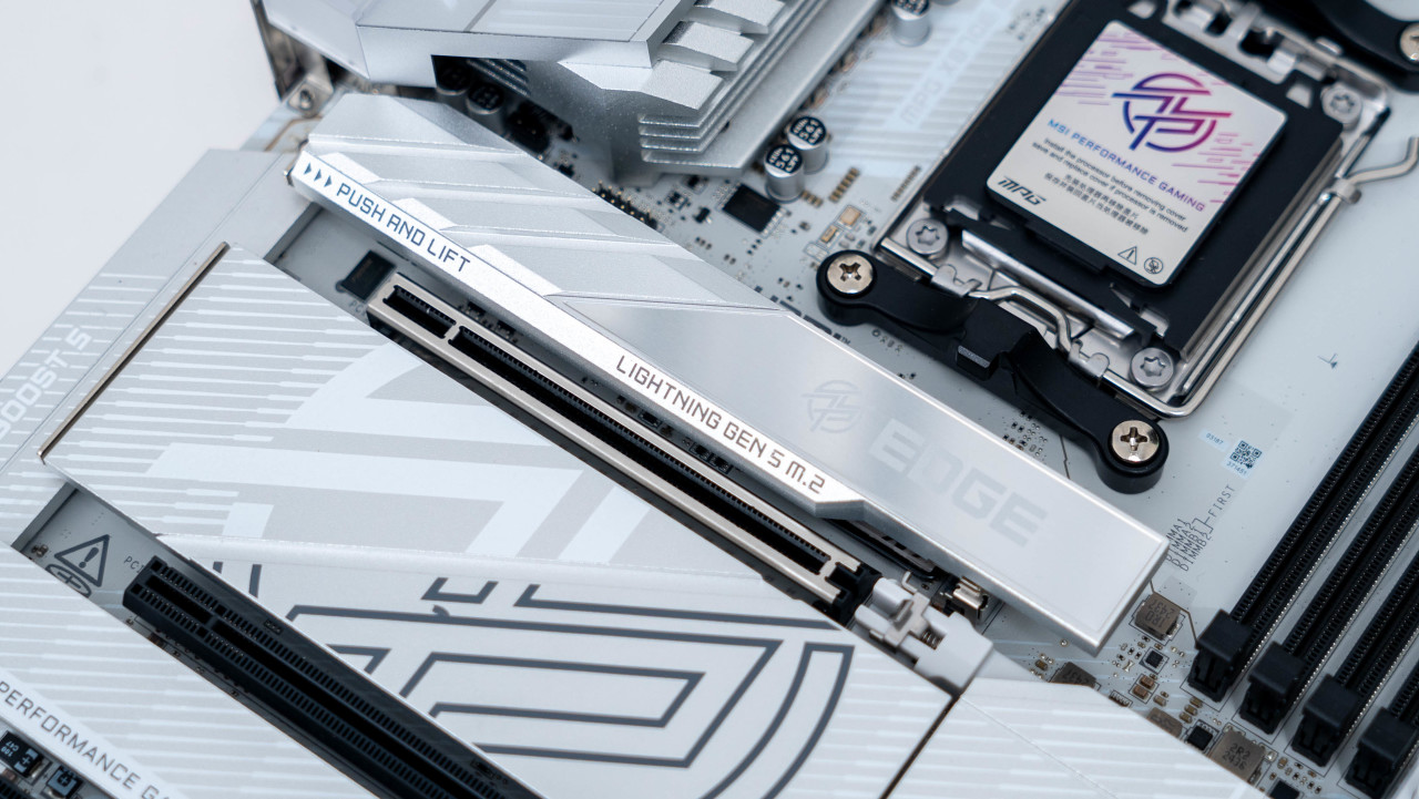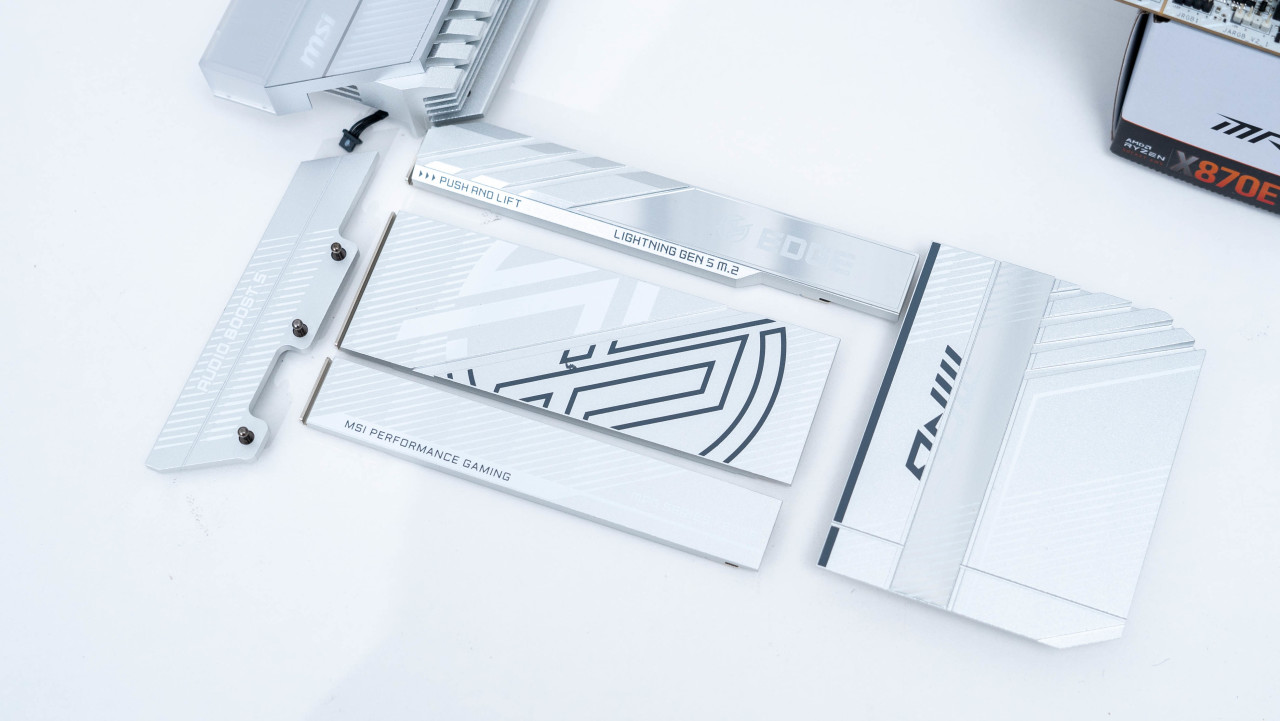对于喜欢白色主板的玩家来讲,微星的刀锋钛系列一直都是一个不错的选择。这次的星MPG 在X870E EDGE TI WiFi 刀锋钛主板采用标准ATX板型设计,采用了银色的散热铠甲搭配白色的PCB颜值更进一步。而且主板提供了四个M.2接口,而且均支持微星M.2 Shield Frozr 快拆散热铠甲设计,拆装替换M.2 SSD都非常方便。