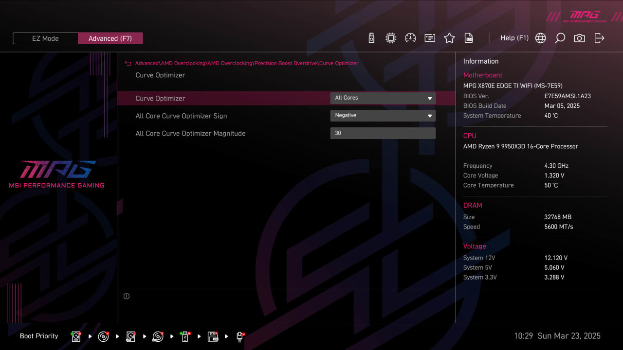 然后进入Curve Optimizer选项,选择开启All Cover所有核心,选择Negative降压,建议从30开始尝试,当然就对于9950X3D这样双CCD的处理器来讲,分别设置CCD负压也是很关键的一个地方。不过都要根据你处理器的体制去操作。
