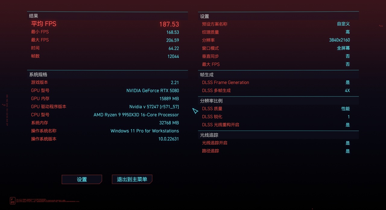 「2077」游戏在4K 分辨率下开启光追的情况下游戏平均帧数达到了187.53FPS,最低帧数168.53FPS。