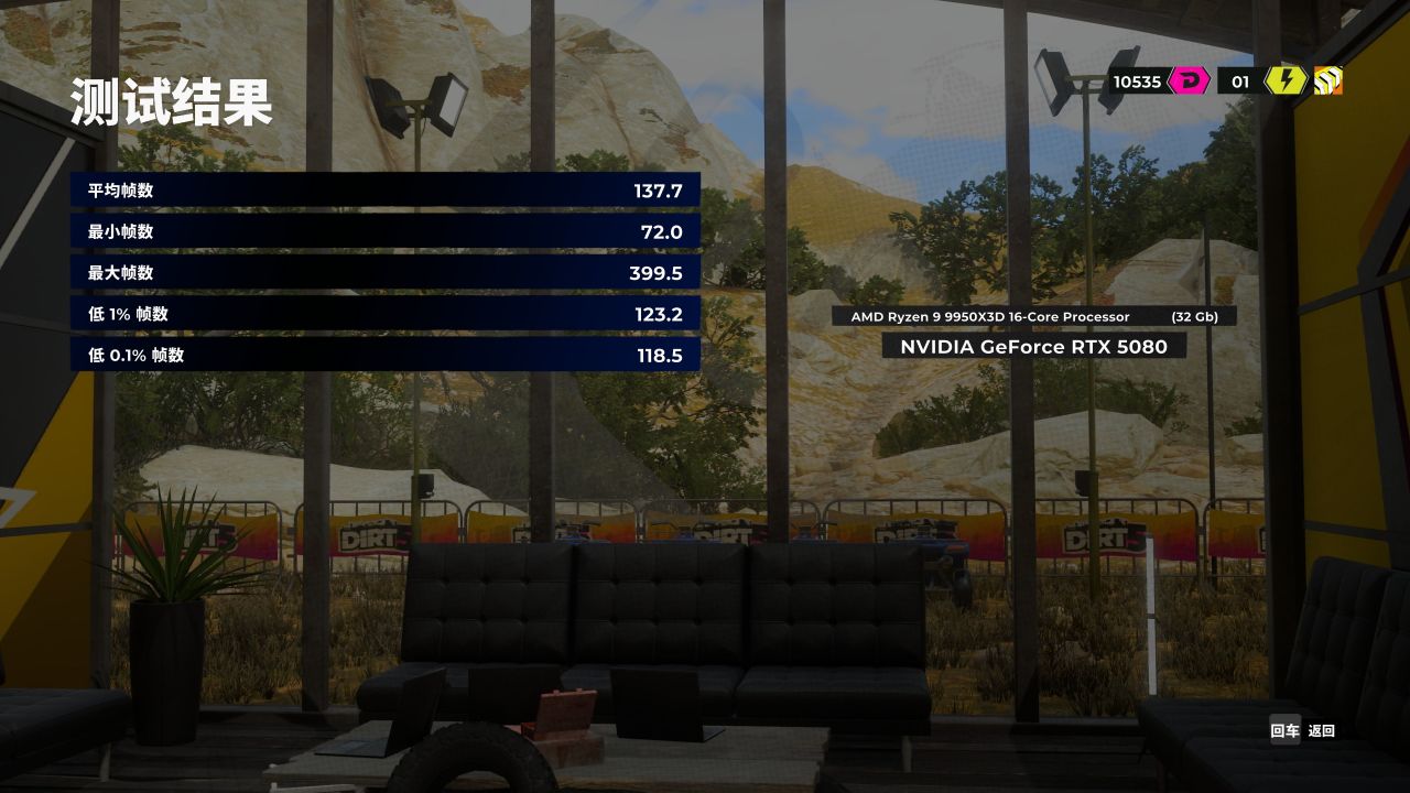 「尘埃5」游戏4K分辨率,预设超高画质下,同时开启光线追踪车辆阴影游戏平均帧数137.4FPS,最低帧72FPS。