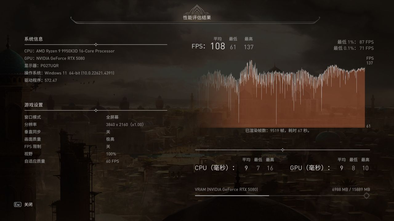 「刺客信条 幻景」4K分辨率最高画质下游戏平均帧数108FPS,最低帧61FPS。