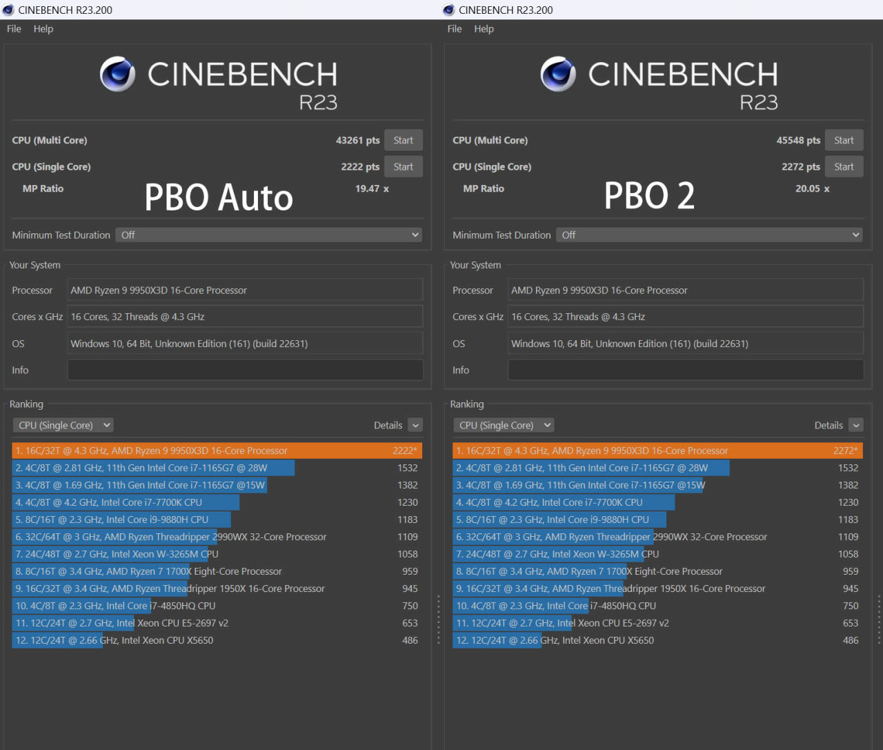 而且玩家通过简单开启设置PBO之后还可以获得额外的性能提升,通过CINEBENCH R23测试可以看到开启PBO 2前后整体分数提升还是非常明显的。多核成绩从原先的43261pts直接冲到了45548pst,目前也看到有不少小伙伴成绩冲到了47000。