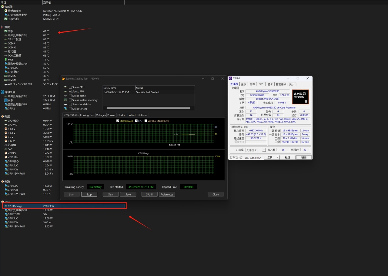 AIDA 64 FPU单烤测试,主板限制9950X3D温度墙为85℃时,测试AIDA64 FPU单烤下处理器温度锁死在85℃,功耗220W。