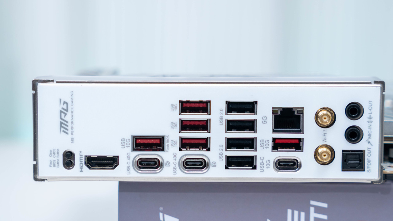 IO接口一览,MPG X870E EDGE TI WiFi 刀锋钛配置了两个支持DP的满血40Gbps的Type-C接口,一个10Gbps的Type-C,五个红色的10Gbps USB-A以及四个2.0的USB接口。有线网口更是直接给了5G的RJ45网口方便扩展,此外像是WiFi7 无线网卡也没落下,WiFi7 无线网卡依旧是标配高通的QCNCM865 芯片,理论峰值速率能达到5.8Gbps,频宽可达320MHz,支持4096-QAM,蓝牙版本为5.4。