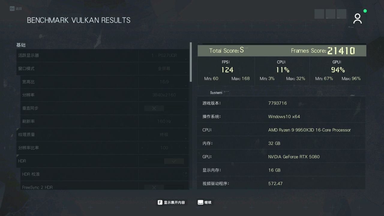 「幽灵行动 断点」4K分辨率最高画质下游戏平均帧数124FPS,最小帧60FPS,得分21410分。