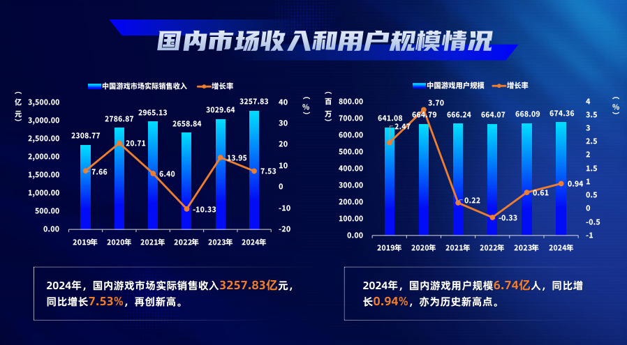 中國音數協遊戲工委發佈的《2024年中國遊戲產業報告》顯示,中國遊戲用戶規模達到6.8億人,同比增速降至1.2%,連續第五年維持在個位數增長;市場實際銷售收入爲3289億元,同比增長3.5%,增速較2023年進一步放緩。