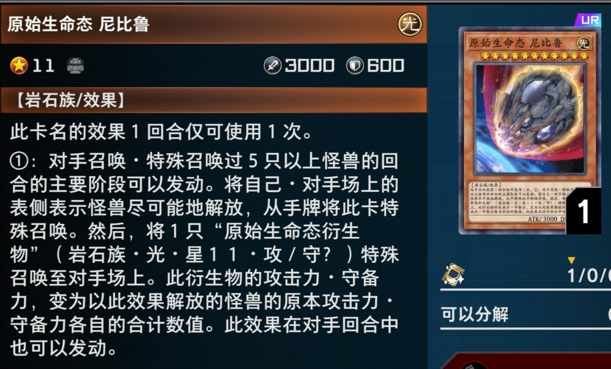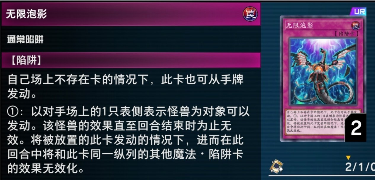 怪獸版「無限泡影」,但是不如泡影。沒有一回合一次的限制,只能在對手主要階段使用,不過還是有挺多人願意投入的。
