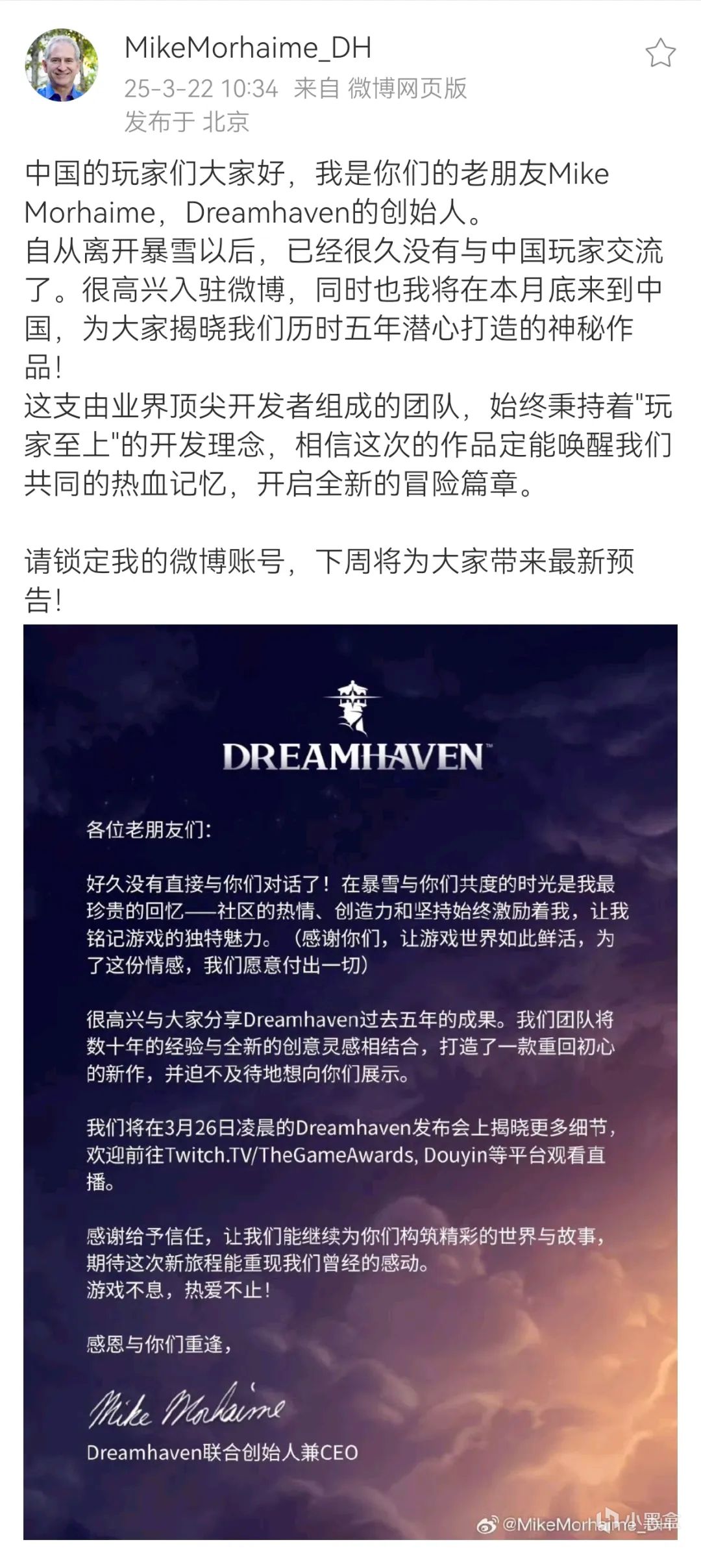 但让人没想到的是,这一等就过了整整5年。直到上周末(3月22日),沉寂许久的Mike Morhaime突然注册了微博、B站等中文社区账号并在上面发声,宣称会在三天后公布新游戏的相关动态。