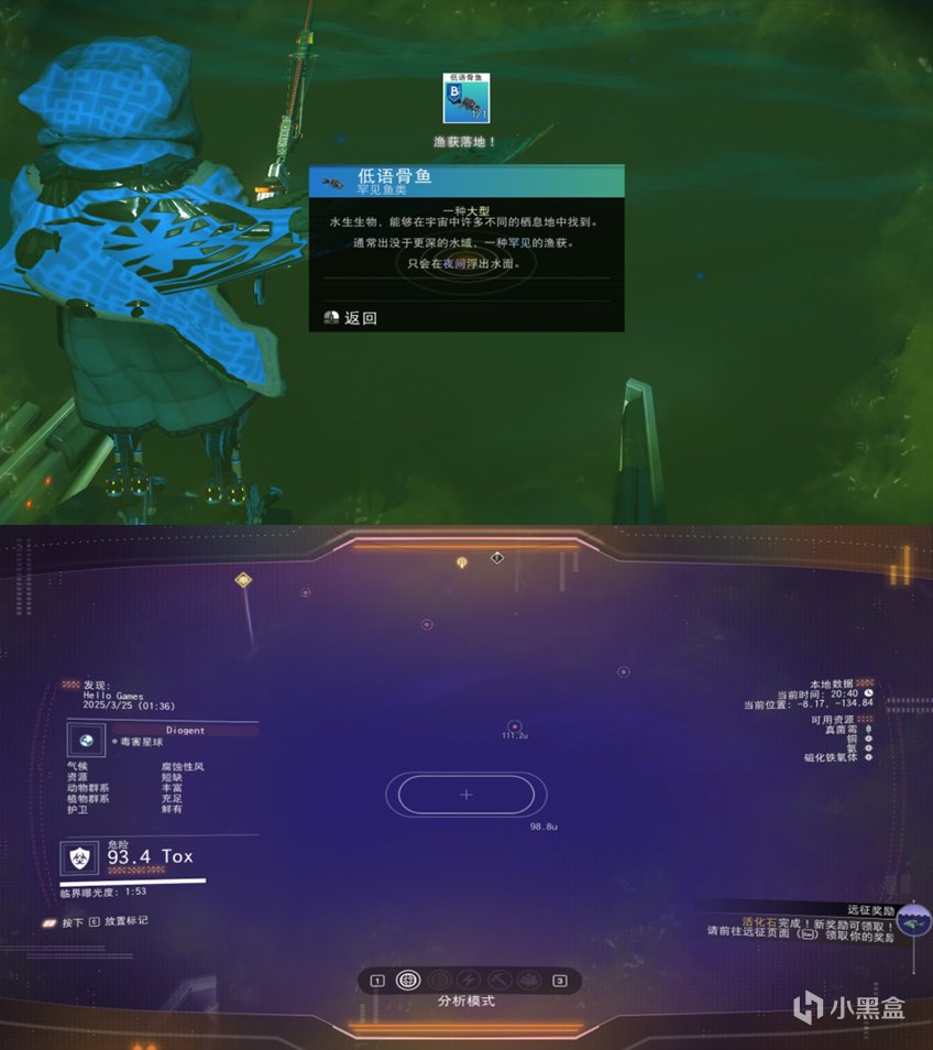 活化石(獎勵:超深淵核心、水中珍寶):最讓我難繃的任務,需要及其強大的耐心/運氣/環境防護模塊,漂白骨魚出沒於毒性星球的深水區,低語骨魚出沒於深夜的深水區,問題是附近星系幾乎沒有深水區,所以我最後的選擇是自己手動把海牀挖深,幾乎把任務給的所有仿生誘餌都用完了才釣上來。