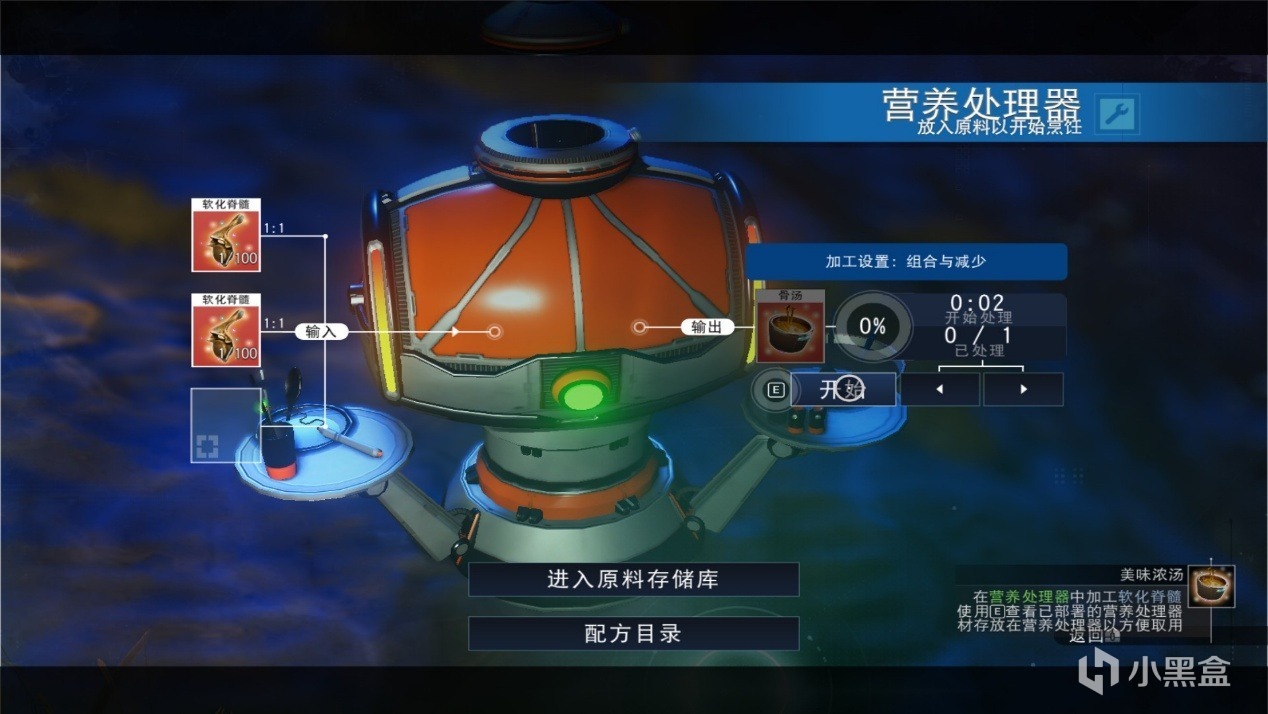 美味濃湯(獎勵:生物樣本):比較靠猜,主要是沒告訴你怎麼做骨湯,其實就是先把隨便一種化石放進去營養處理器做成軟化脊髓,然後把兩份軟化脊髓分別放進營養處理器的兩個格子裏,就能做出骨湯。