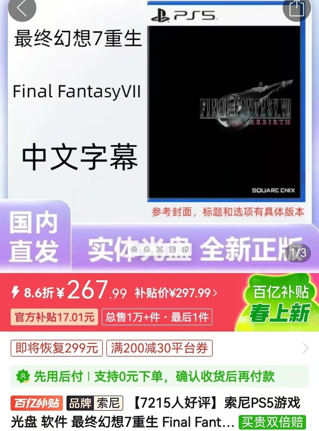 ff7領卷後價格來到了260+,個人認爲這個價位還是相當合適的,畢竟這遊戲一直沒什麼降價趨勢,lz已經購入了,有興趣的盒友們看需購入!!