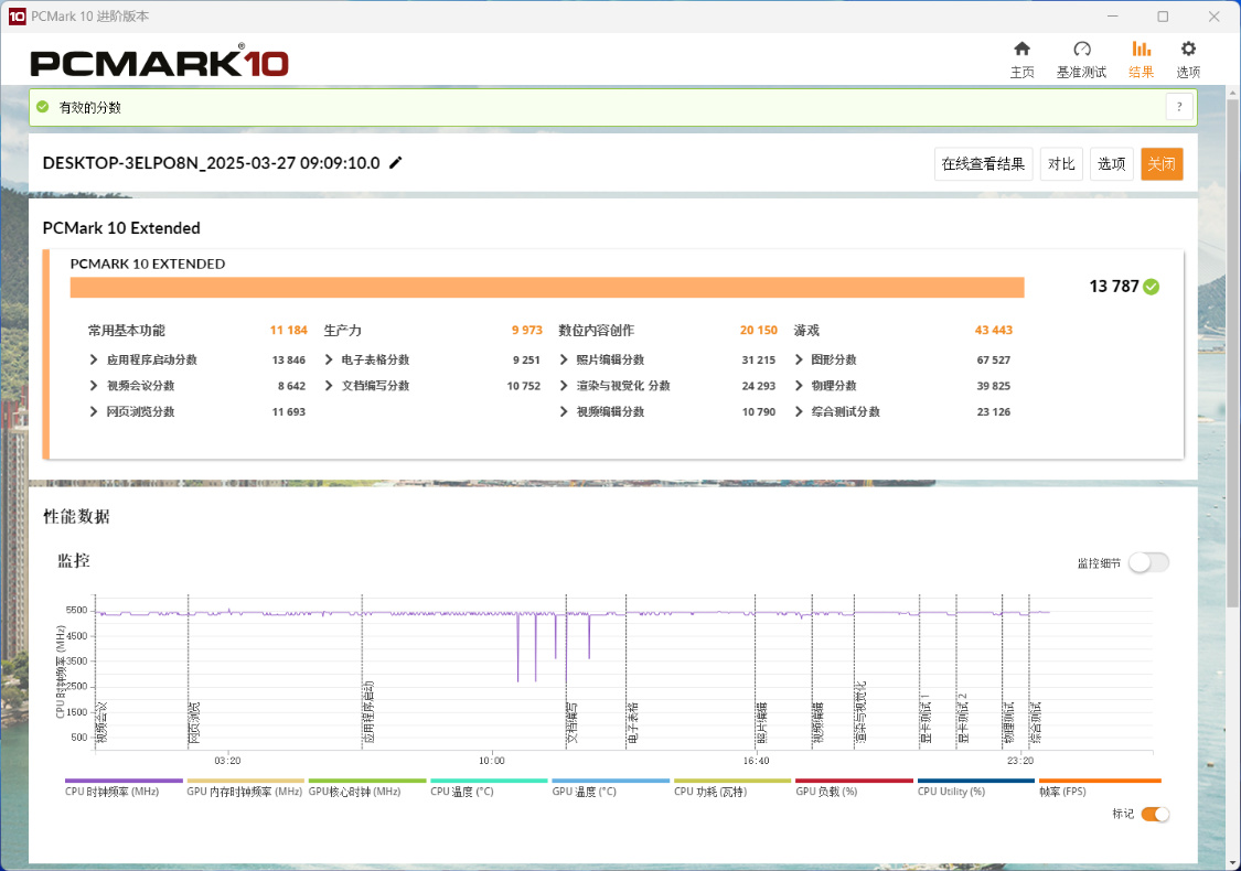 PC Mark Extended整機測試,整機得分13787分,常用基本功能得分11184分,生產力得分9973分,數爲內容創作得分20150分,遊戲得分43443分;