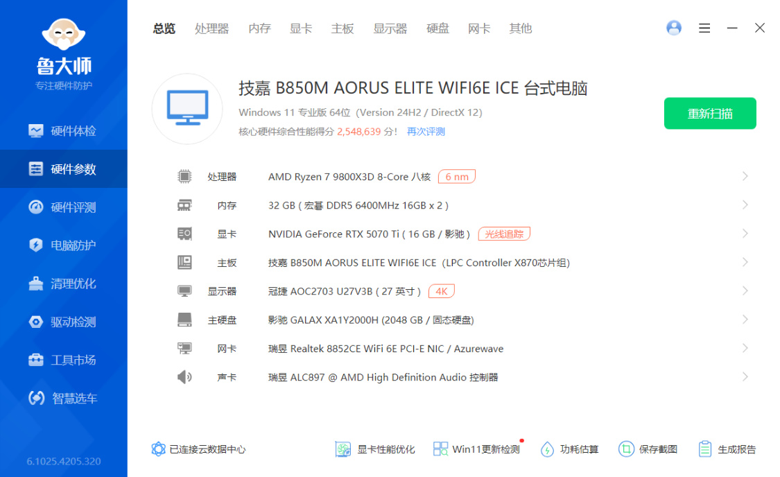 配置單:AMD R7-9800X3D處理器、技嘉B850M AORUS ELITE WIFI6E ICE主板、影馳RTX 5070Ti 金屬大師白金版OC 顯卡、宏碁掠奪者Hera影鋒D5-6400MT/s C30冰戟銀16G*2內存、星曜7000Plus 2T M.2固態硬盤、星曜G360白色一體式水冷、閃鱗G600白色副屏版實木機箱、影馳GL-850 ATX3.1金牌全模組電源、影馳星曜GB-120散熱風扇*4(3反 + 1正)...整機散件行情應該在1.5W以內,僅供參考。