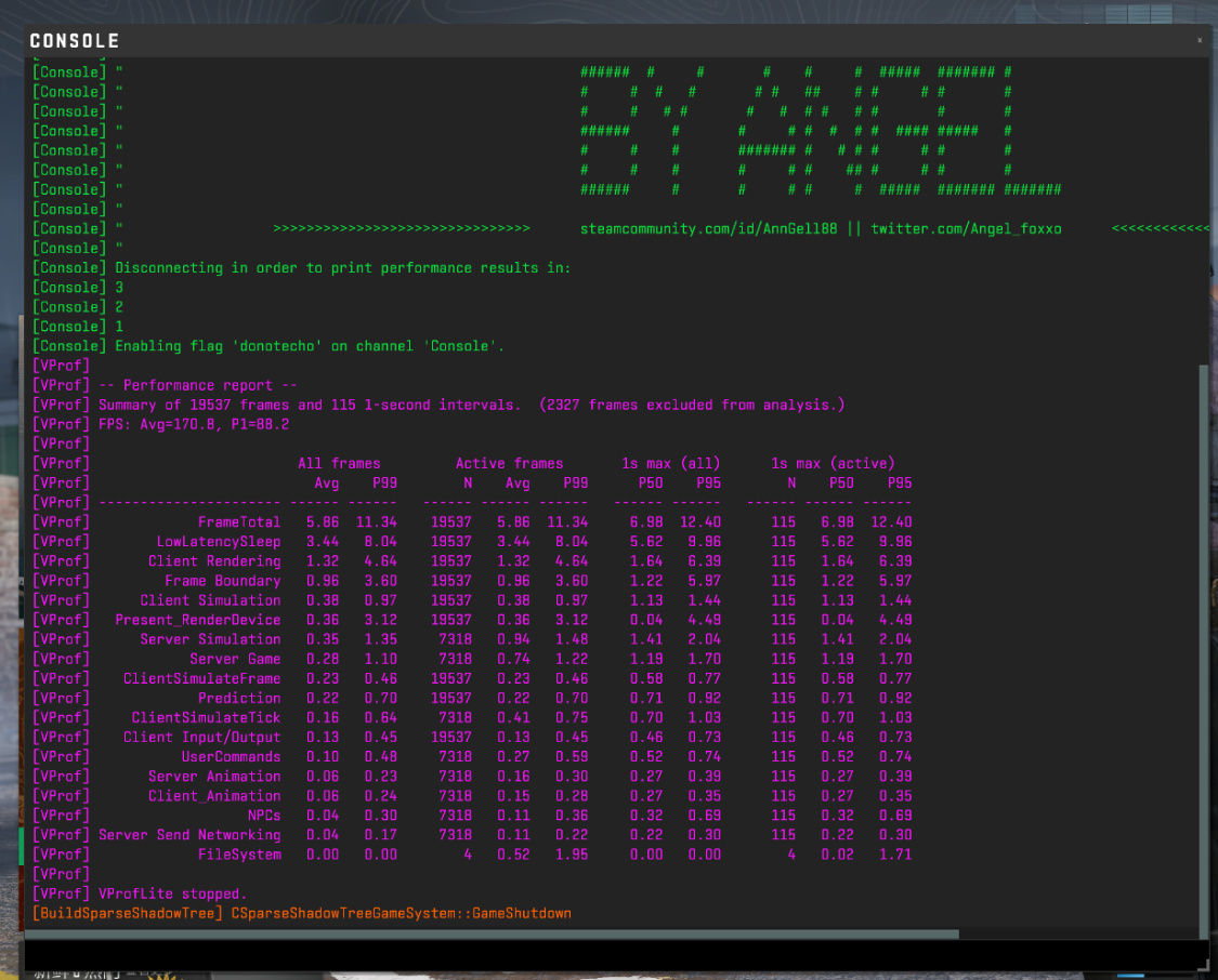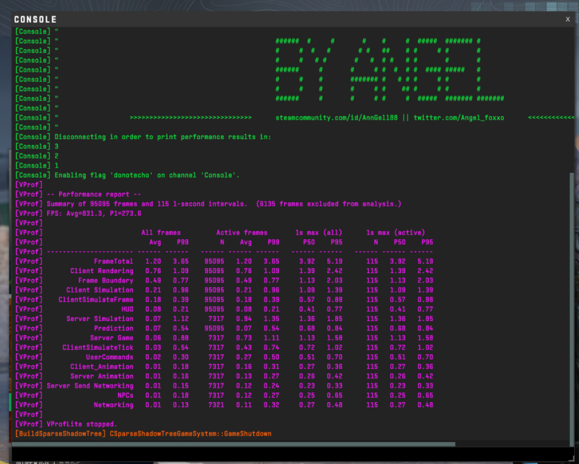 《CS2》遊戲,使用創意工坊中的CS2 Benchmark模組進行測試,將遊戲畫質預設設爲非常高,4K分辨率下,遊戲平均幀數爲170.8 FPS,1%LOW幀爲88.2 FPS。將畫質預設設爲低,1080P分辨率下,遊戲平均幀率爲831.3 FPS,1% LOW幀爲273.6 FPS;