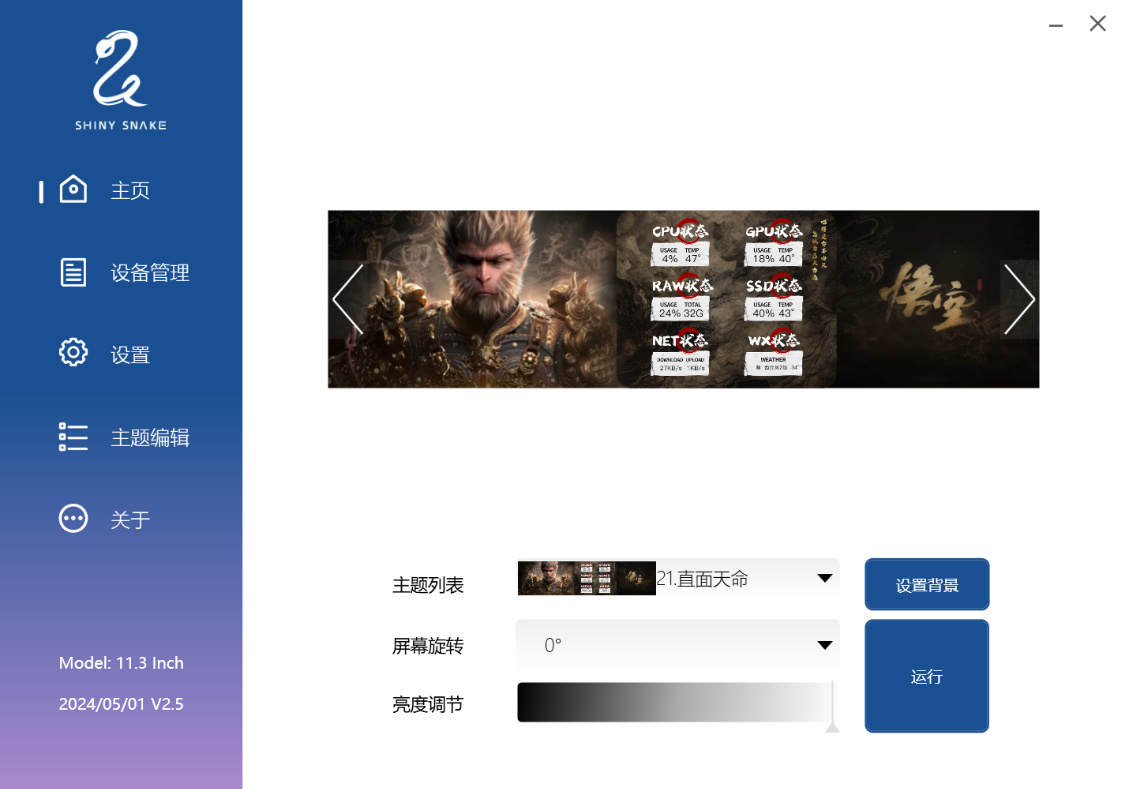 除了緊湊的體積,機箱最吸睛的還是這塊11.3寸的副屏。屏幕分辨率1920*480,通過USB 2.0插針線連接主板,搭配上閃鱗的副屏軟件,可以讀取主機硬件溫度、使用率、天氣、網速等信息,玩家也可以自定義設計屏幕顯示的文字、圖標等元素。軟件出廠內置了20+款不同風格的屏顯主題,玩家可以根據自己的喜好選擇副屏主題,同時這些主題也都支持背景圖片更換,可玩性拉滿。(擔心USB2.0接口不夠用,一分二的轉接線瞭解一下?)