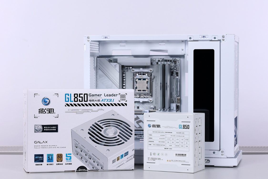 電源方面,本次裝機推薦的是這款影馳GL-850 ATX 3.1 金牌全模組電源,全白配色,140mm短機身,符合最新的ATX3.1、PCIe5.1標準,採用的是全臺系高品質105度耐溫電容,通過80plus金牌認證,原生搭載12V-2x6顯卡供電接口,可以完美滿足RTX40/50系顯卡供電需求。同時,電源還支持5年質保。