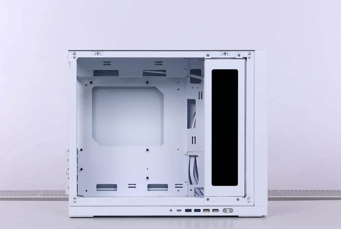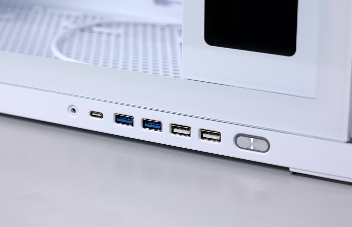 機箱I/O面板位於鋼化玻璃側板下方,除了一個帶有白色燈環裝飾的開機鍵以外,還提供了1個10Gbps Type-C、2個USB 3.0、2個USB 2.0以及1個3.5mm口。