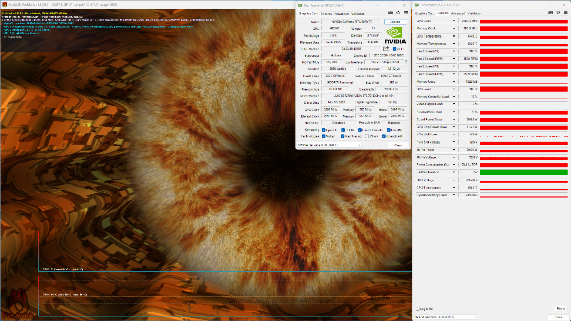 FurMark烤機測試,烤機15Min,顯卡溫度爲65°左右,顯卡功耗爲300W左右;