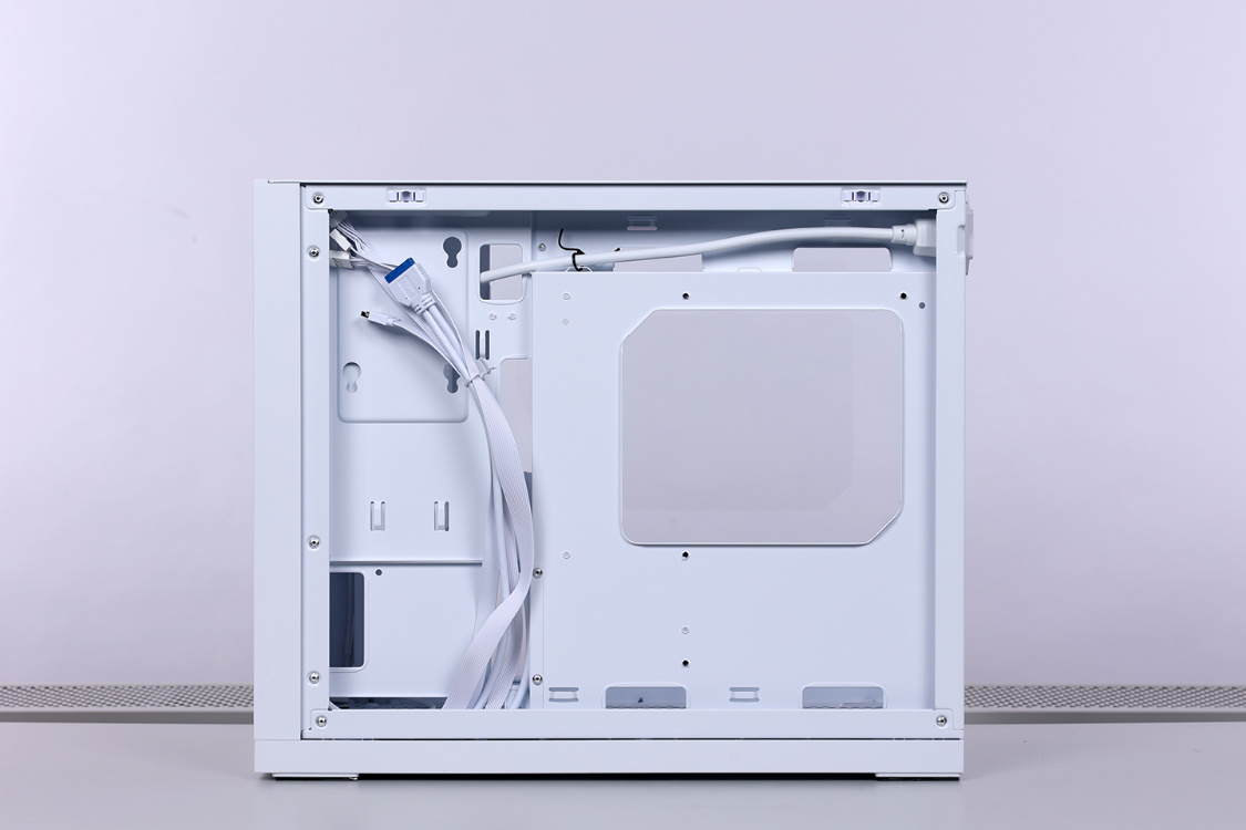 機箱主機板背面空間充足,機箱前面板內部提供了一塊獨立的理線空間,在這個空間中,機箱還預留了1塊2.5寸硬盤的安裝位,大量的紮帶固定孔位也能降低理線難度。