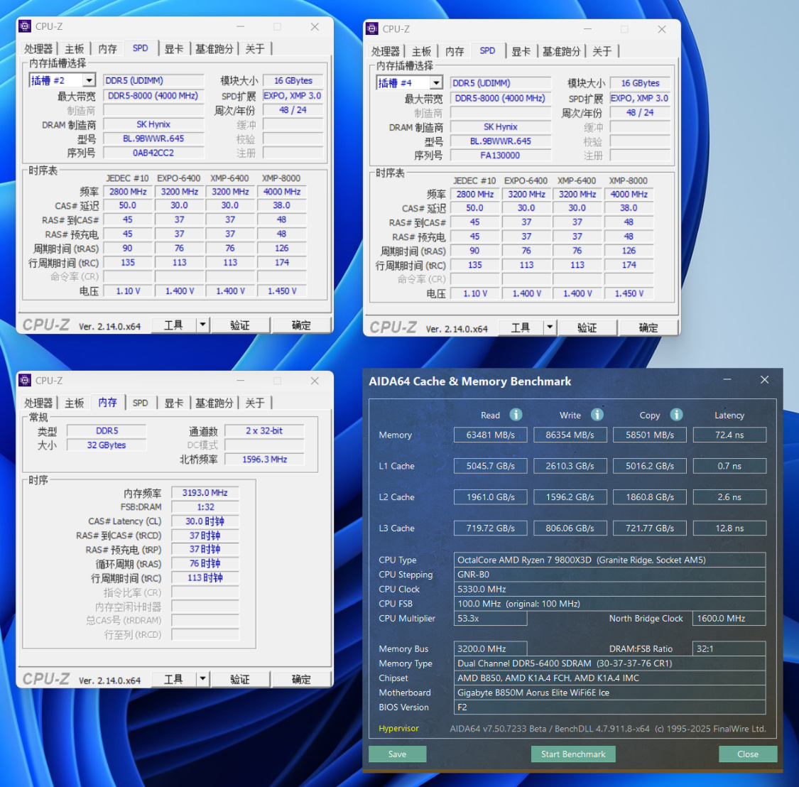 Aida 64內存讀寫測試,直接開啓EXPO和技嘉XMP/EXPO高頻寬功能。內存讀取速度爲63481 MB/s,寫入速度爲86354 MB/s,複製速度爲58501 MB/s,延時爲72.4 ns;