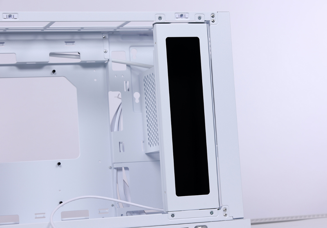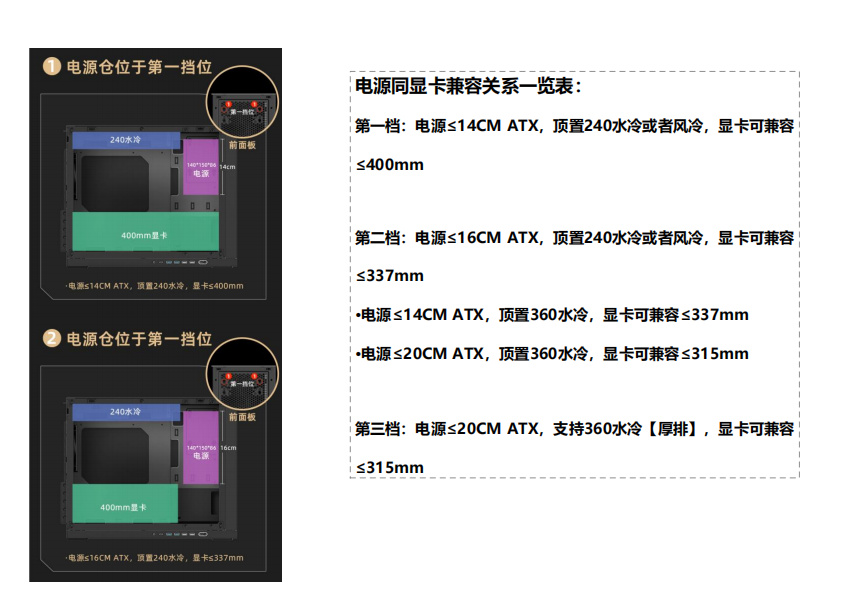機箱採用電源倉前置的設計,兼容ATX電源,並支持3檔高度調節的設計。不同安裝高度下,顯卡和水冷散熱最大安裝尺寸也不一樣。