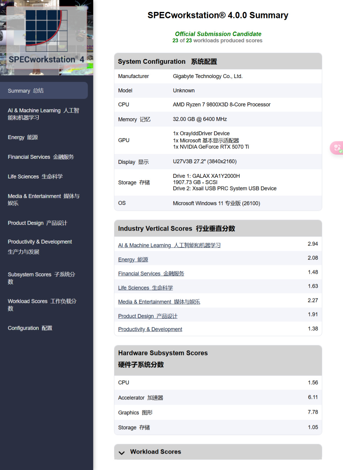 SPECworkstation® 4.0.0是SPEC最新發布的硬件生產力測試,這套測試軟件可以測試出CPU、顯卡等硬件在應對AI人工智能、能源、金融、設計、傳媒等不同行業生產力需求時,可以帶來多少性能表現。經過測試,這套以RTX 5070Ti 顯卡爲核心的平臺,在AI人工智能與深度學習行業軟件測試中得分2.94分,在能源行業軟件測試中得分2.08分,在金融行業軟件測試中得分1.48分,在生命科學行業軟件測試中得分1.63分,在媒體娛樂行業軟件測試中得分2.27分,在產品設計行業軟件測試中得分1.91分,在生產力與發展行業軟件測試中得分1.38分;