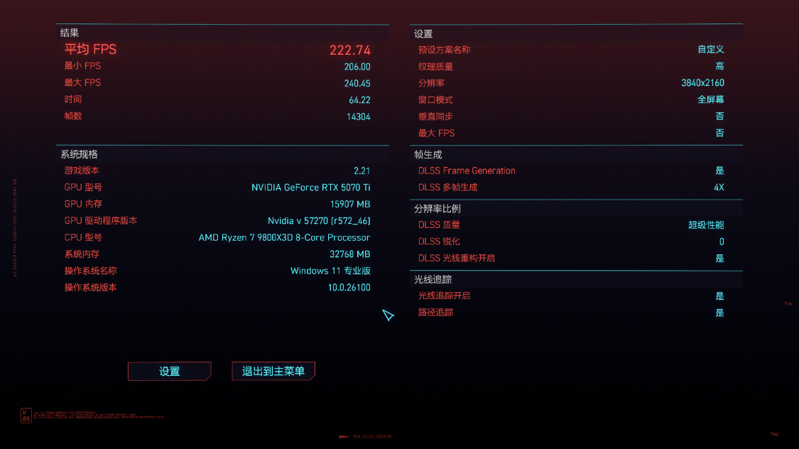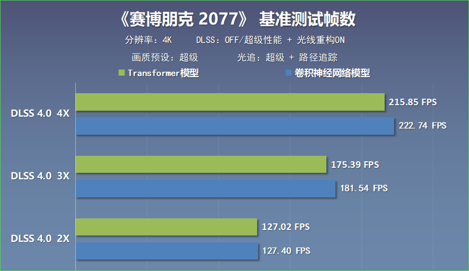 《賽博朋克2077》基準測試,超級畫質,路徑追蹤模式,4K分辨率下,開啓超級性能模式的DLSS,並將多幀生成倍率設爲2X,使用卷積神經網絡模型,遊戲平均幀率爲127.40 FPS。使用Transformer模型,遊戲平均幀率爲127.02 FPS。將多幀生成倍率設爲3X,使用卷積神經網絡模型,遊戲平均幀率爲181.54 FPS。使用Transformer模型,遊戲平均幀率爲175.39 FPS。將多幀生成倍率設爲4X後,使用卷積神經網絡模型,遊戲平均幀率爲222.74 FPS。使用Transformer模型,遊戲平均幀率爲215.85 FPS。