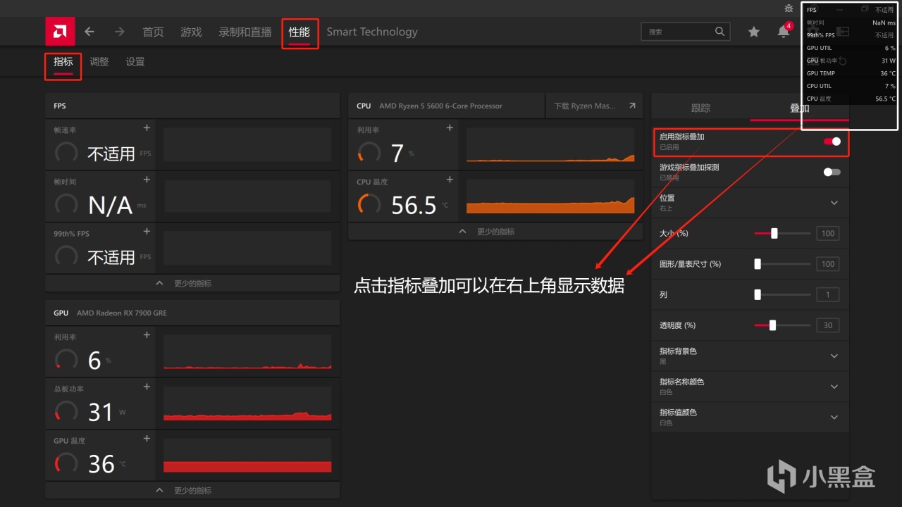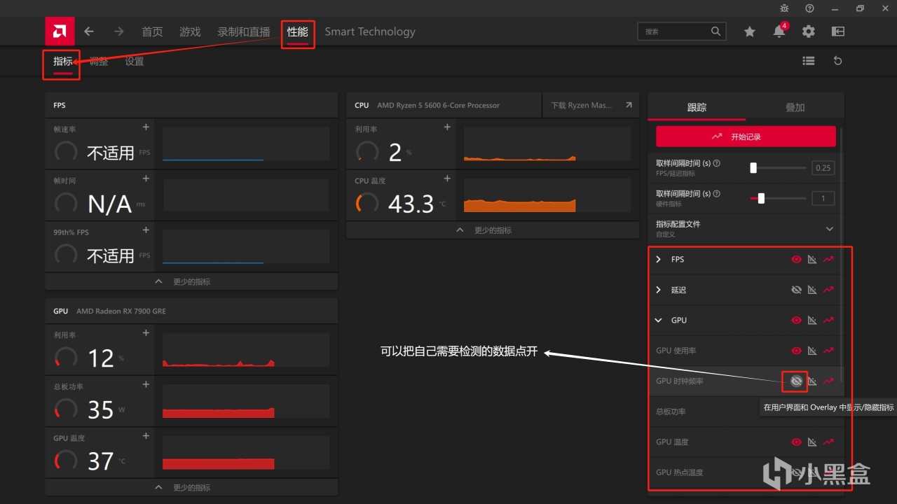 3.性能→指标这里可以选择你想检测的数据例如帧数,gpu占用率等,点击启用指标叠加可以显示在屏幕上