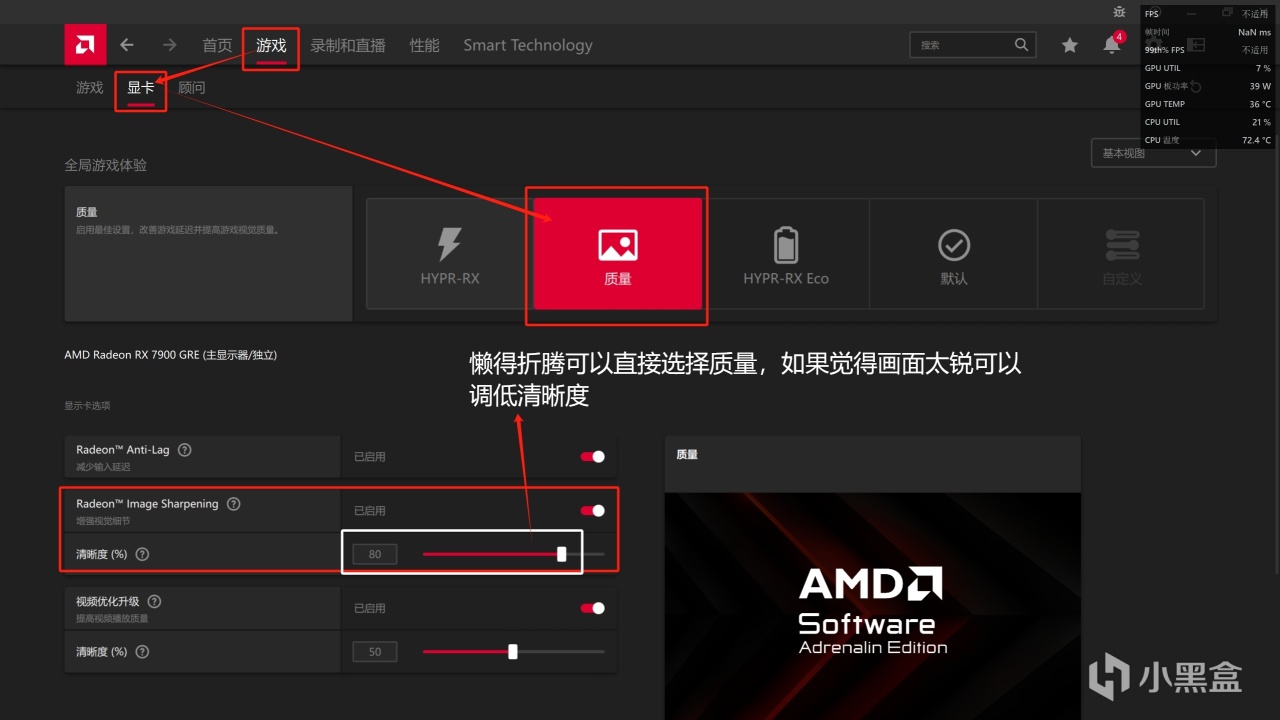 5.点击游戏→显卡懒得折腾可以选择质量,觉得游戏画面太锐利则降低清晰度(只推荐选质量和默认和自定义)