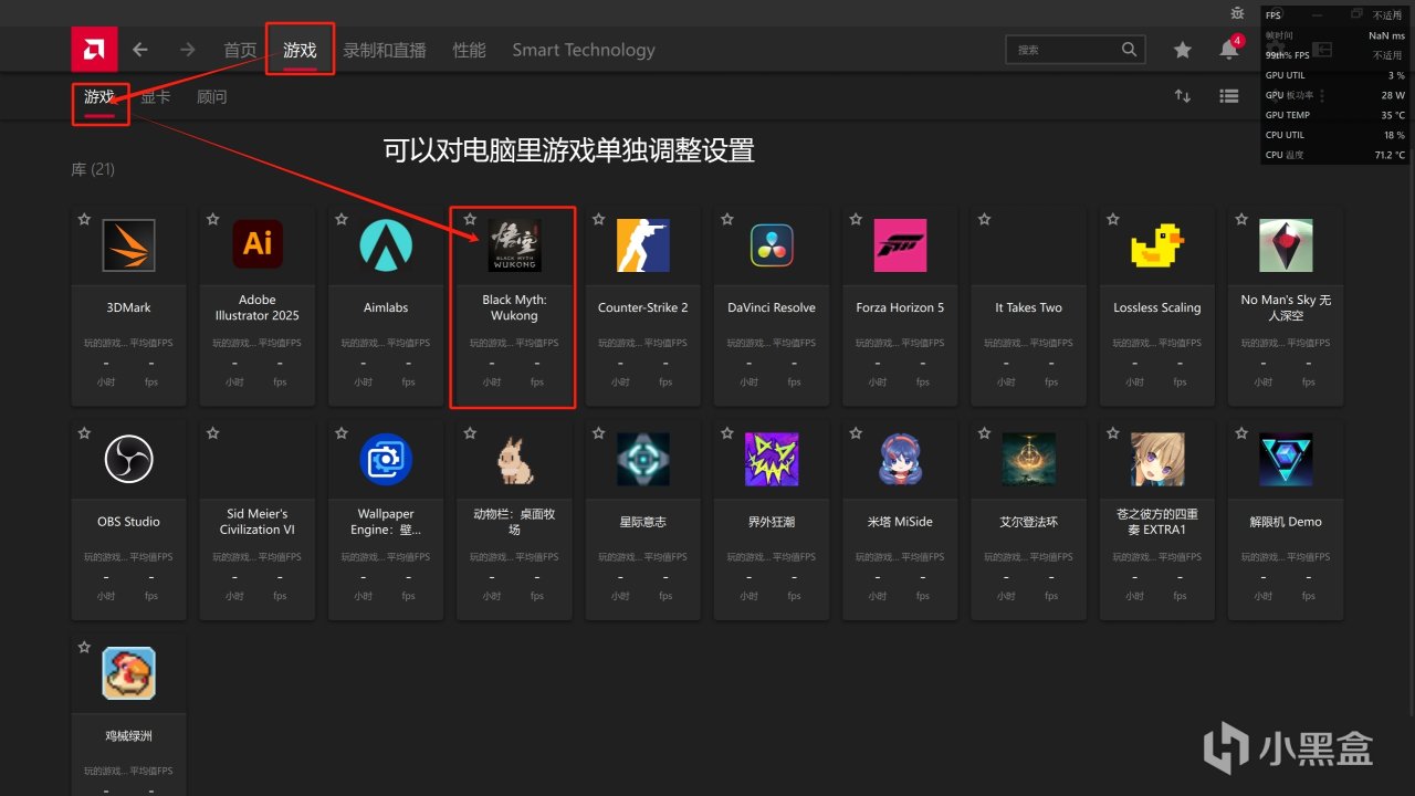 4.点击游戏显示出电脑内的游戏,可以根据游戏需要调节单独的设置