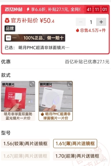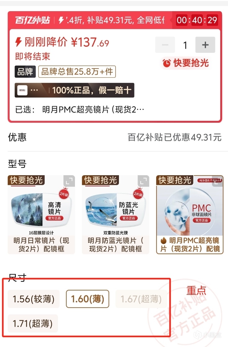 4.確定好自己要的鏡片品牌,型號可以搜索整個品牌的鏡片對比價格,例如這兩個是一個商家一模一樣的鏡片,我買的130寫個攻略虧了30,他家一模一樣的pdd搞優惠100塊錢就能拿下,現在還在一邊寫攻略一邊哭