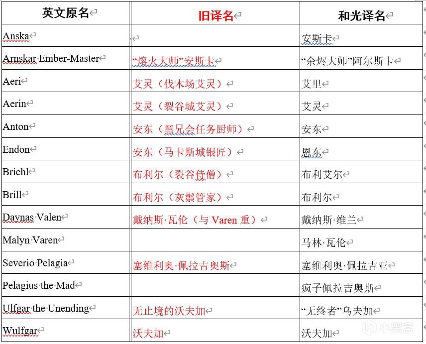 原有各版汉化或多或少都有存在不同NPC因读音相近而导致翻译时翻译为同名的情况。我们在汉化过程中参考了其他汉化时发现了这一问题。其中skyrim中重名者有二十人左右。部分名称及改动结果如下: