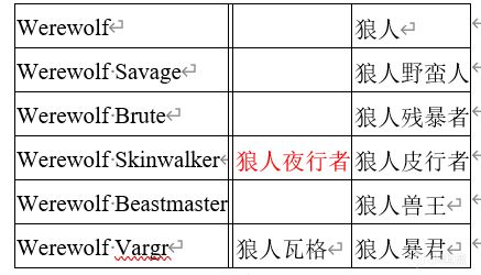 狼人怪物中同样出现了问题,就是最高级的“Vargr”被音译做了“狼人瓦格”,语义上容易被误解为“名叫瓦格的狼人”。经过查阅词典和综合前面的等级用语,暂定为“暴君”。另某些汉化中将“Skinwalker”误解为“夜行者”也是错误,已改为“皮行者”(取自美国怪谈中的一种怪物)。