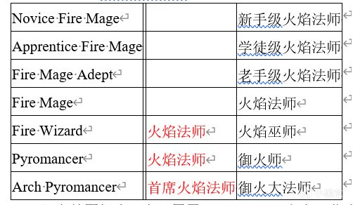 关于职业名称,也是曾经一大重灾区。一些职业名词被混用翻译为同一个汉语名词。其中尤以法师相关最严重。Mage、wizard等都被直接翻译为“法师”。为加以区分,根据使用习惯:Mage—法师、wizard—巫师。至于Archmage,尽管“首席法师”本身含义无误,但这个词不仅是法师公会与冬堡学院的领袖称谓,更是对冬堡学院的创始人沙利多的尊称,并被后世沿用到有成就、有地位的法师身上,因此“大法师”更加合适。Pyromancer一类被简单翻译成“火焰法师”导致与同属低级怪物重名的问题。将“Pyromancer”定为“御火师”、“Cryomancer”定为“御冰师”、“Electromancer”定为“御电师”由此实现各级法师野怪的名字区分。