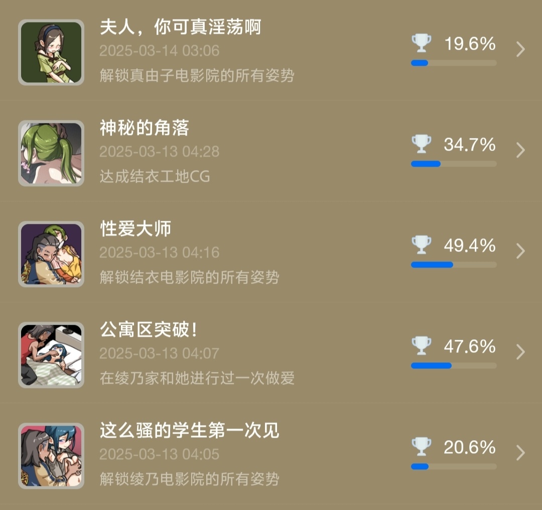 商店店员结衣:每天早上过去对话,等她告诉你愿意看电影的时候,你就可以在16-18这个时间段看见她了,同样也是电影院3个cg,然后凌晨两点去工地,碰到三次之后,第四次在工地左上角有个黑影,就会触发多人cg了,以后就可以去便利店线下了,这条线就完了