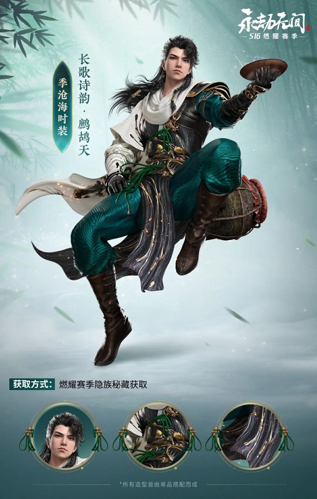 風沙酷暑,快雪時晴,松石色勁裝搭配黑金皮甲,山高路遠不懼行。且飲一杯,天地皆被擁入這暢快胸懷。